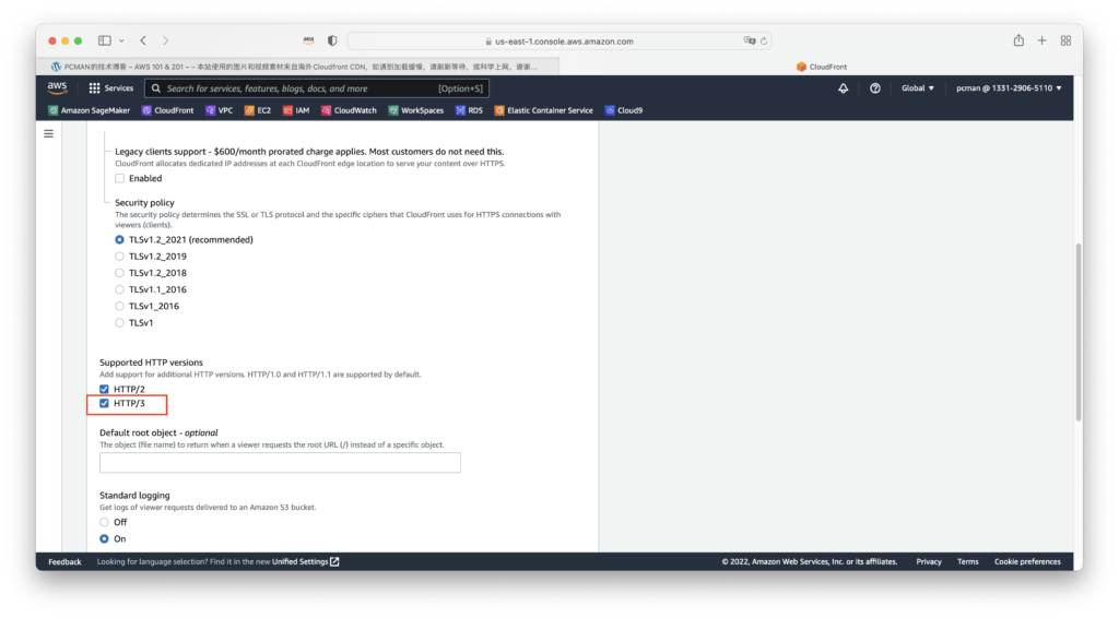 HTTP3在CloudFront的发布点界面,可以一键开启。