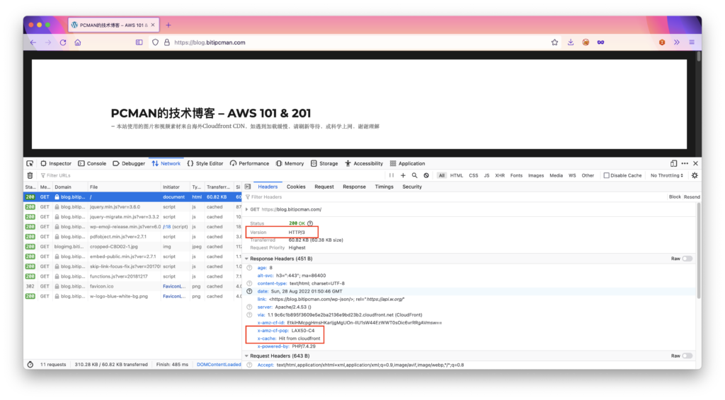 通过上图可看到,CloudFront在用户访问的前段可通过HTTP3进行加速,而源站这一侧,因为源站都是在AWS云上,所以相对网络开销不大,默认的HTTP1.1即可满足。