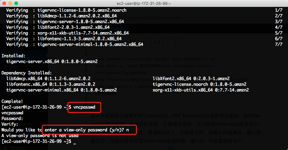 现在界面将提示设置VNC Password。VNC Password分成管理员密码,和View-only只观看密码。这里我们设置一个管理员密码,并且停用View-only观看用户。输入密码时候注意复杂度,需要8位以上,含特殊字符,并输入两遍确认。输入两遍之后,当提示是否设置View-only密码时候,输入N,不设置观看用户。