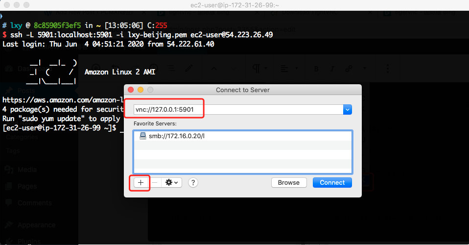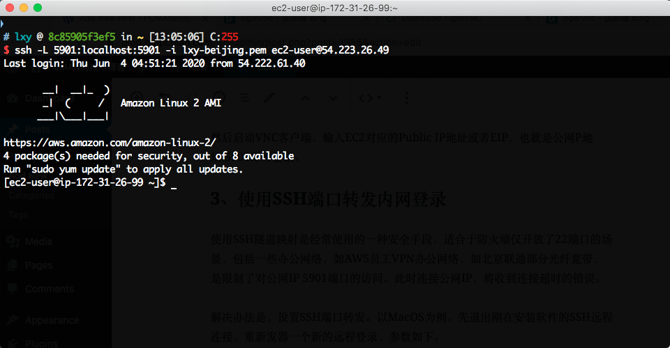 使用SSH隧道映射是经常使用的一种安全手段,适合于防火墙仅开放了22端口的场景,包括一些办公网络,如AWS员工VPN办公网络,如北京联通部分光纤宽带,是限制了对公网IP 5901端口的访问。此时连接公网IP,将收到连接超时的错误。解决办法是,设置SSH端口转发。本方法对中国区适用,对于连接海外的EC2 SSH效果很差,可能因为国际互联网问题无法连接或者随时中断。