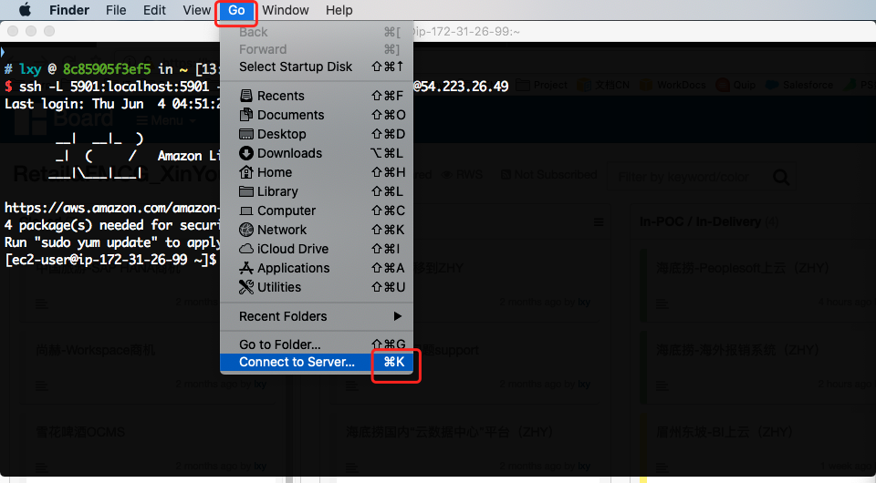 接下来就可以启动客户端登录了。回到MacOS上,用鼠标点击桌面,然后从任务栏上选择Go,从下拉框中找到 Connect to Server的按钮。这个快捷键是Command+K,也可以使用快捷键操作。如下截图。