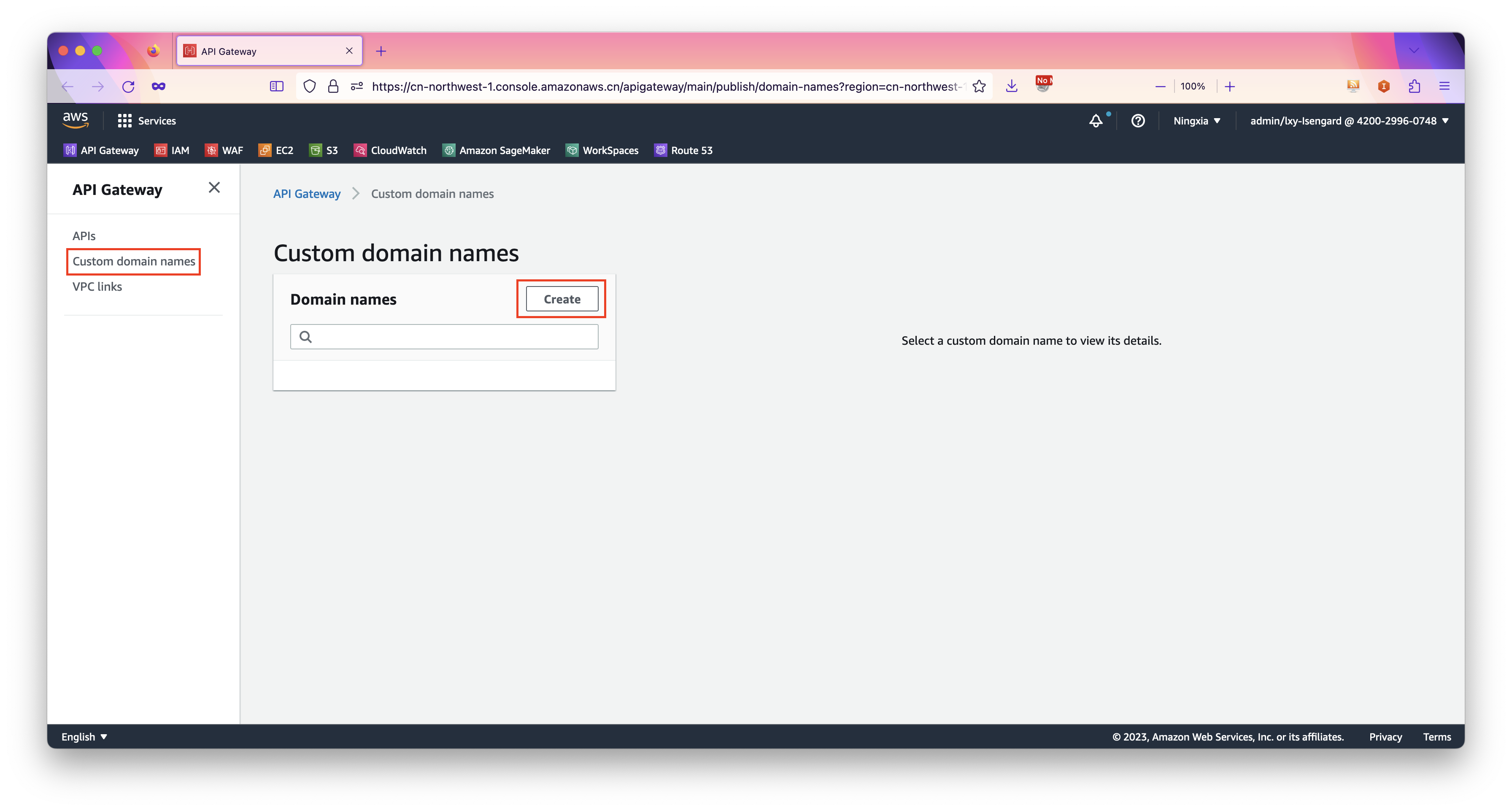 进入API Gateway的界面,点击左侧菜单custom domain name