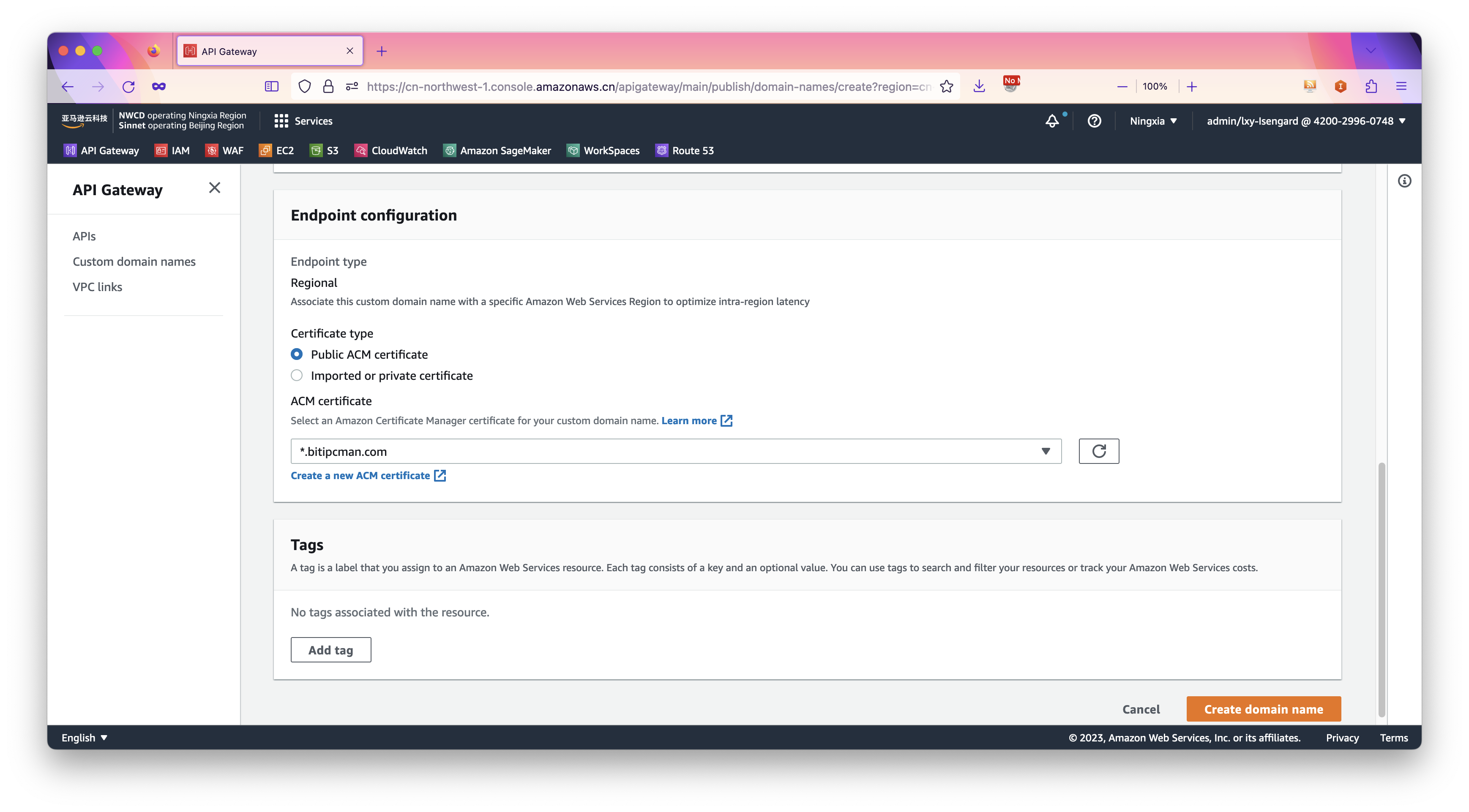 ,然后从下拉框中选择事先在本Region配置好的ACM证书。最后点击右角的Create domain name