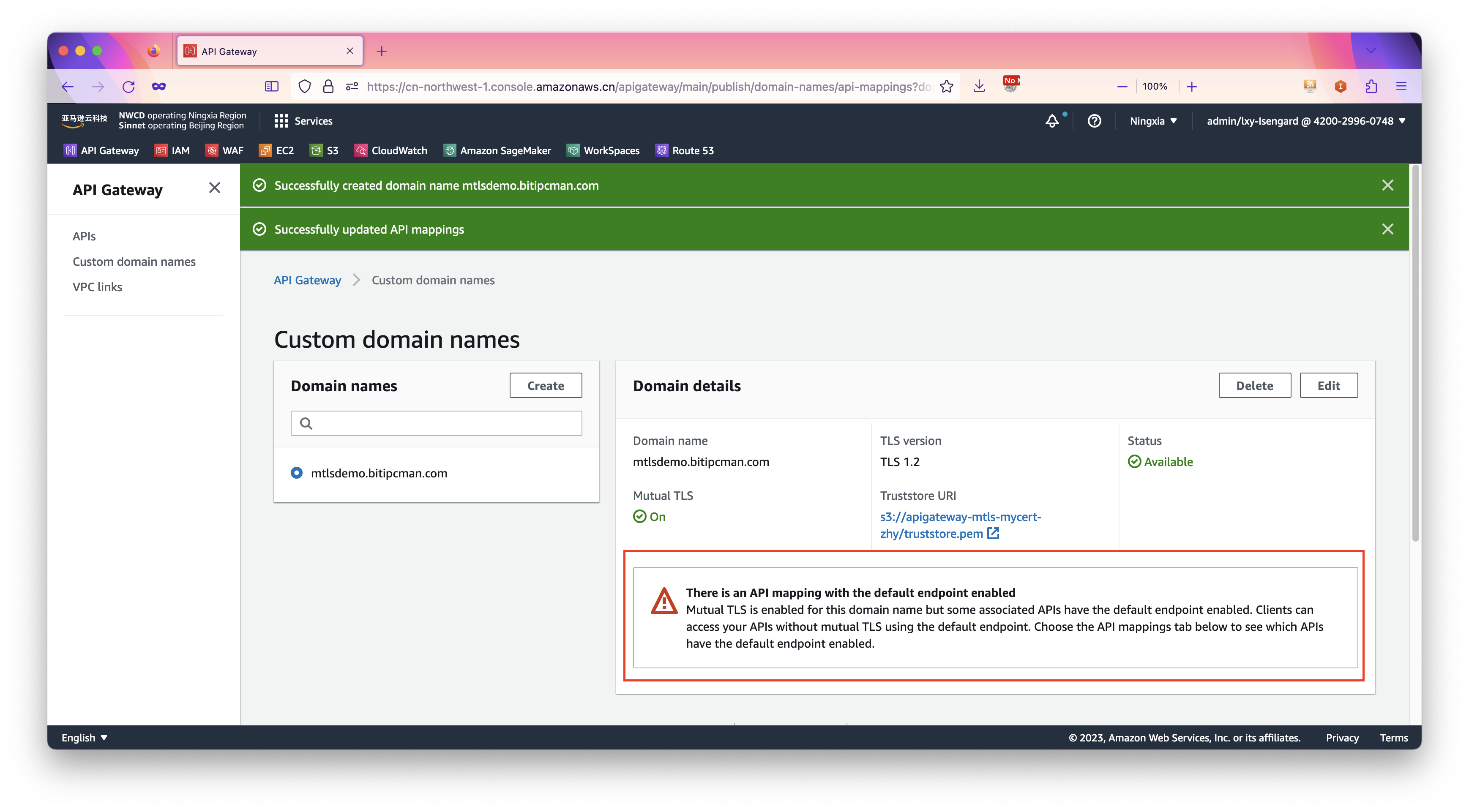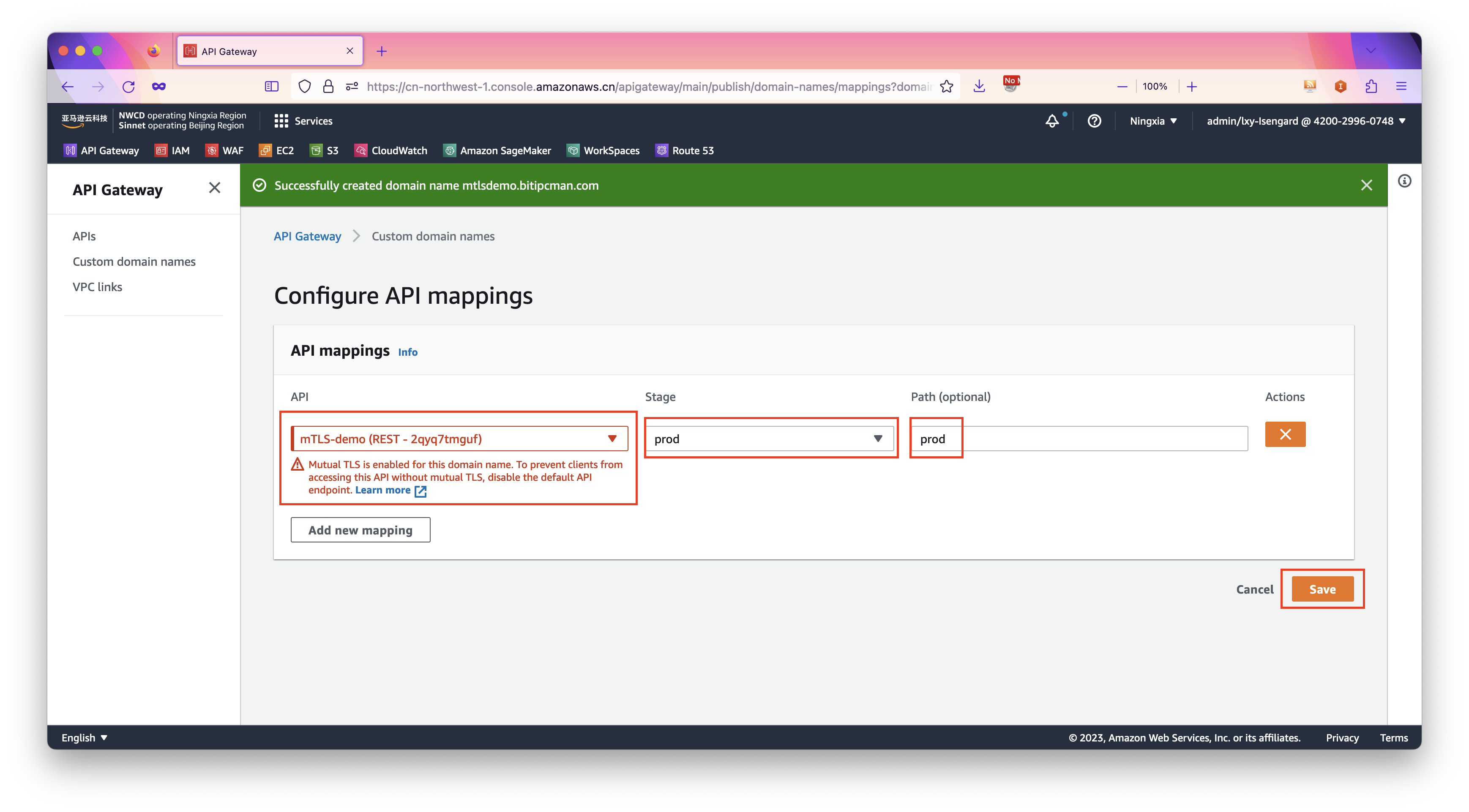 - 绑定:然后通过API Mapping方式将原API Gateway与新的mTLS认证的Endpoint进行关联