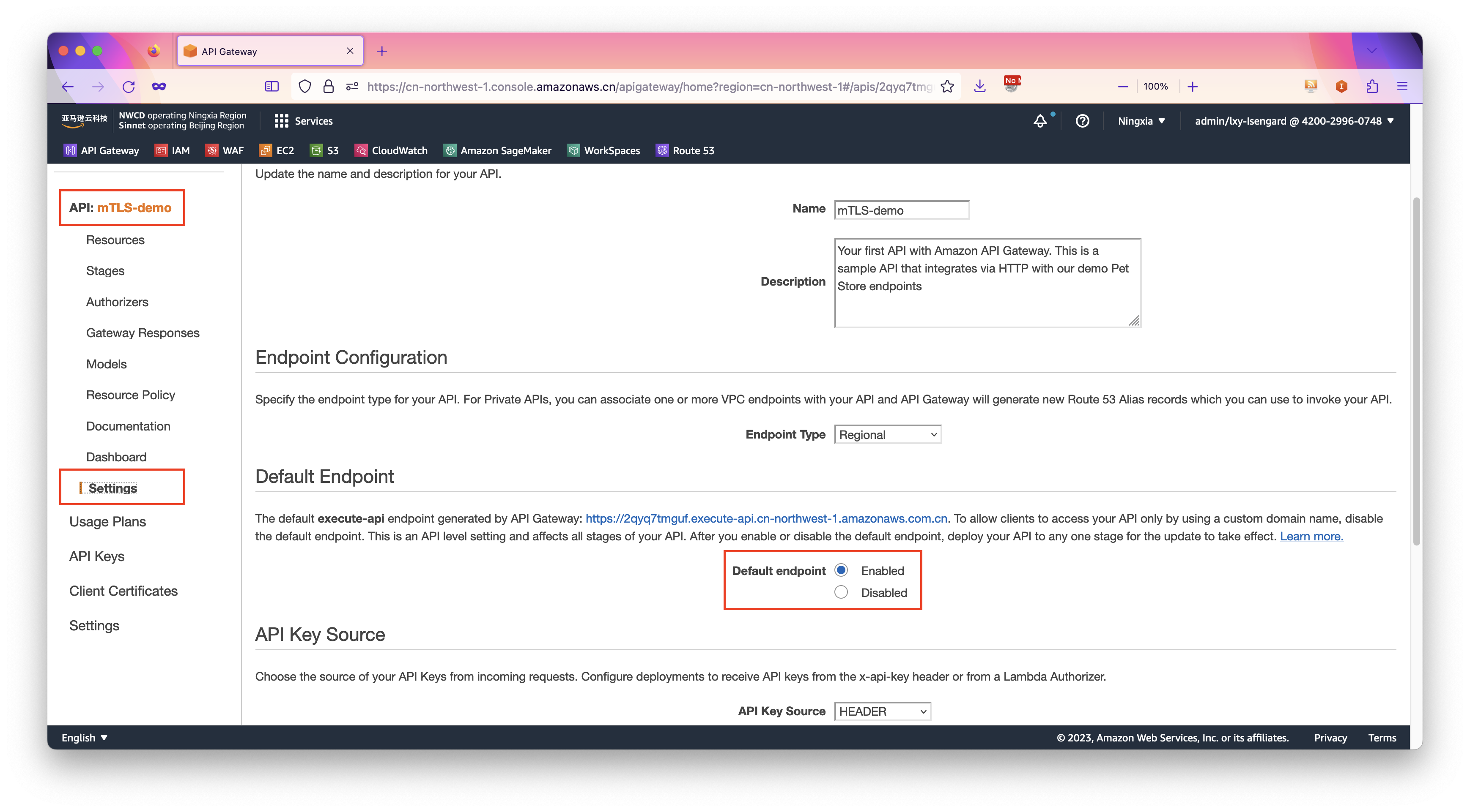 - 创建Endpoint:使用自定义域名功能,通过绑定别名和来自Amazon Certificate Manager(ACM)的证书,生成一个仅支持的mTLS的新的Endpoint