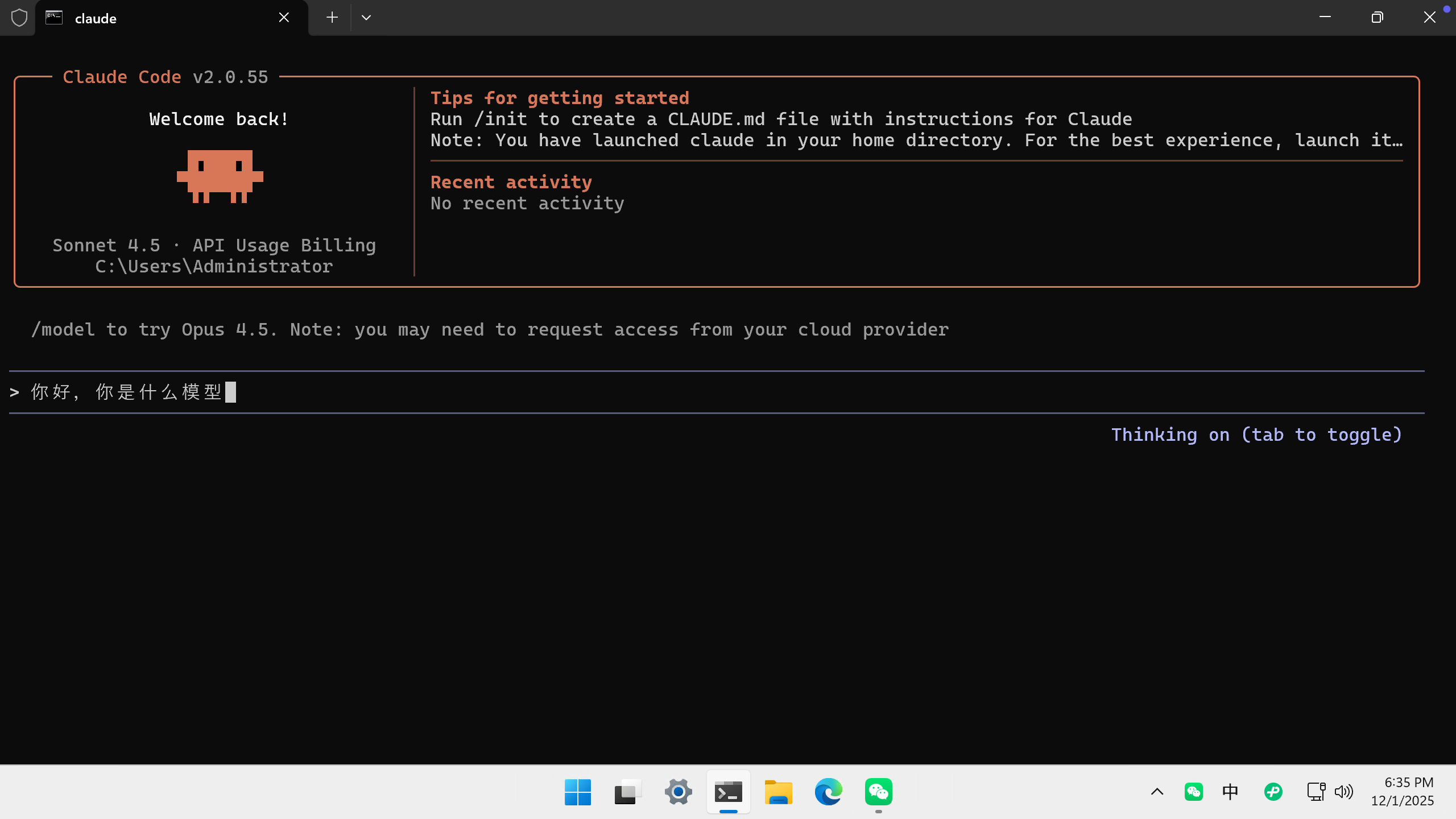 在cmd命令行下输入claude,并按回车,即可启动。