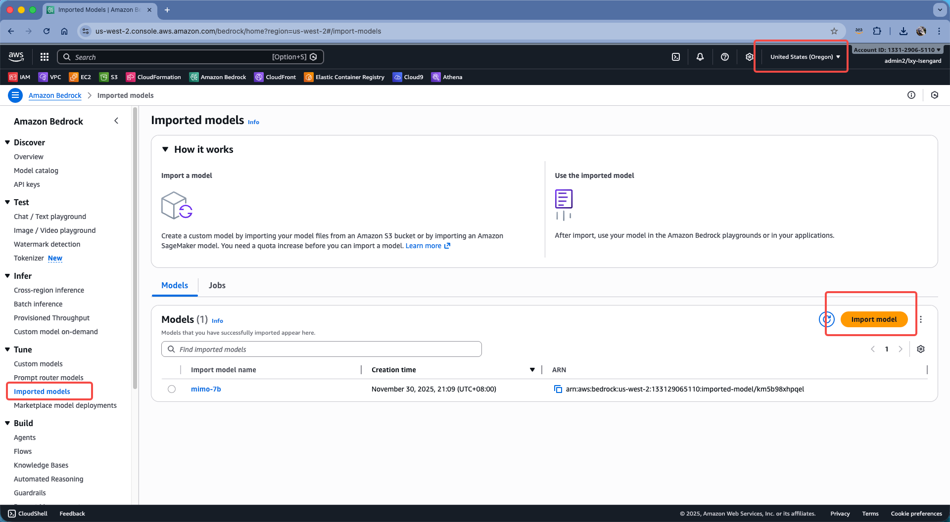 登陆到Bedrock控制台。切换到要使用模型的Region。从左侧的菜单中找到Import models,在右侧点击Import model按钮。如下截图。