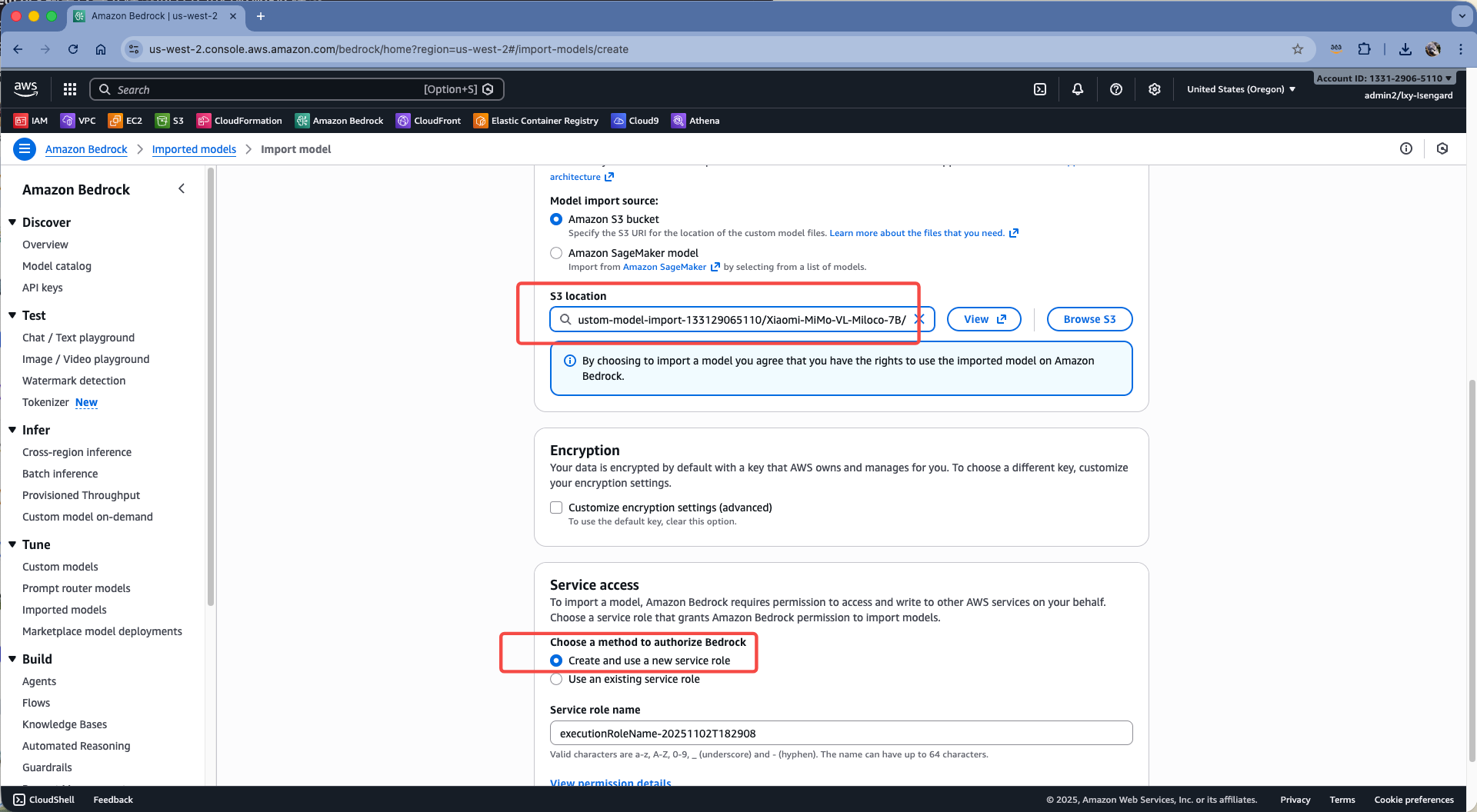 在存储桶位置,选择上一步上传模型的S3桶,注意不要选择存储桶根目录,而是要指定模型所在的目录。然后在Service access位置,选择自动创建service role。如下截图。