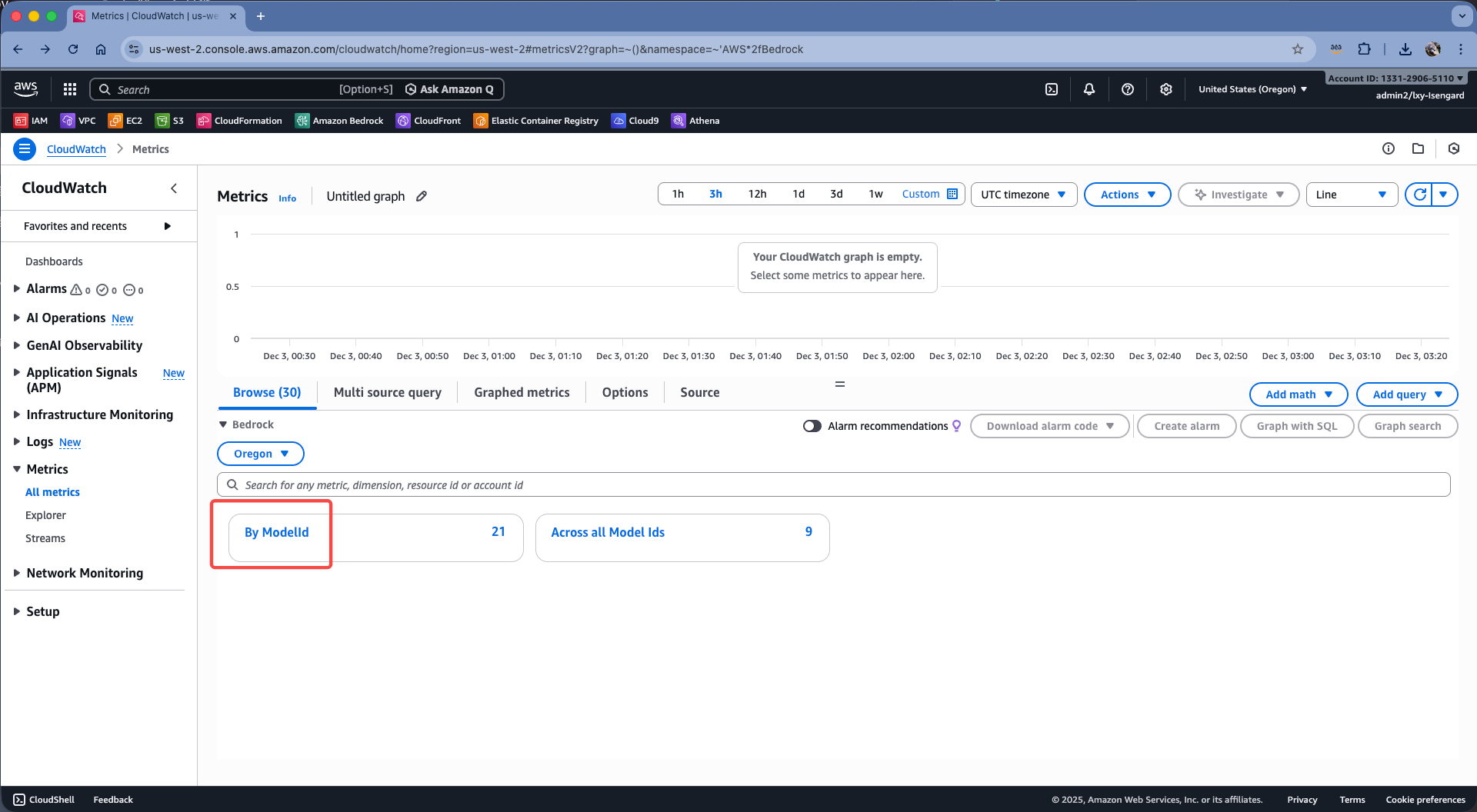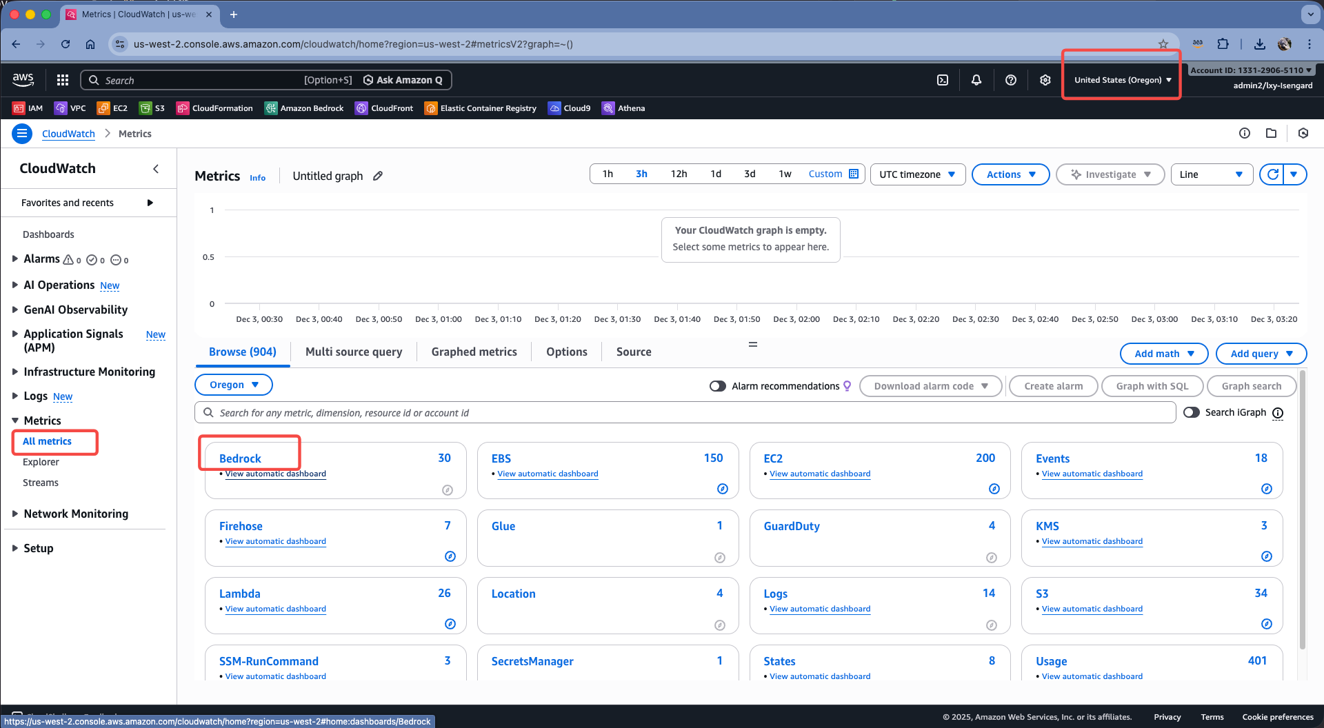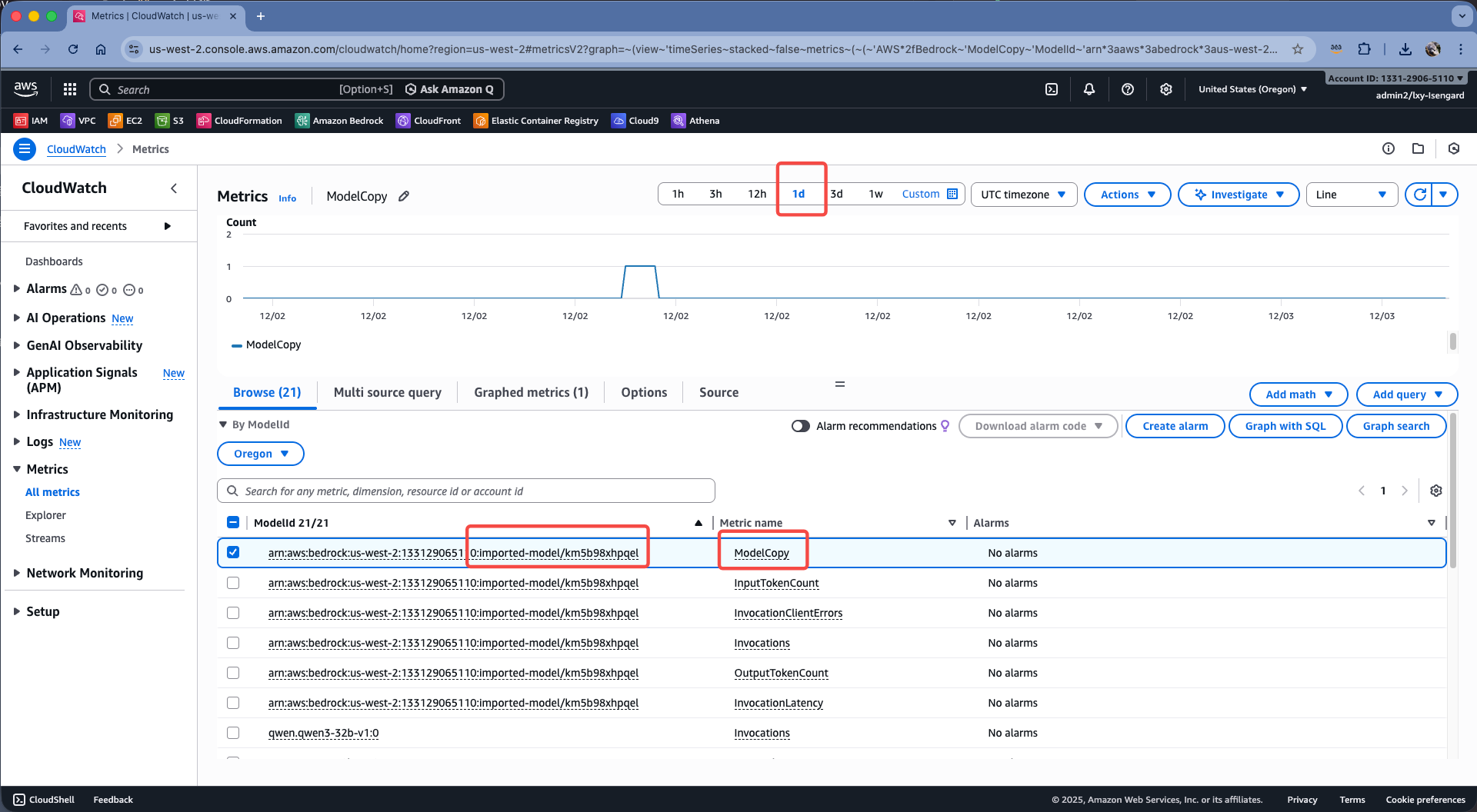 查看模型运行占用的资源的方法是:在CloudWatch的Metrics中查看活跃的模型副本数量。方法是进入CloudWatch,点击左侧菜单的Metrics,点击Bedrock服务。如下截图。