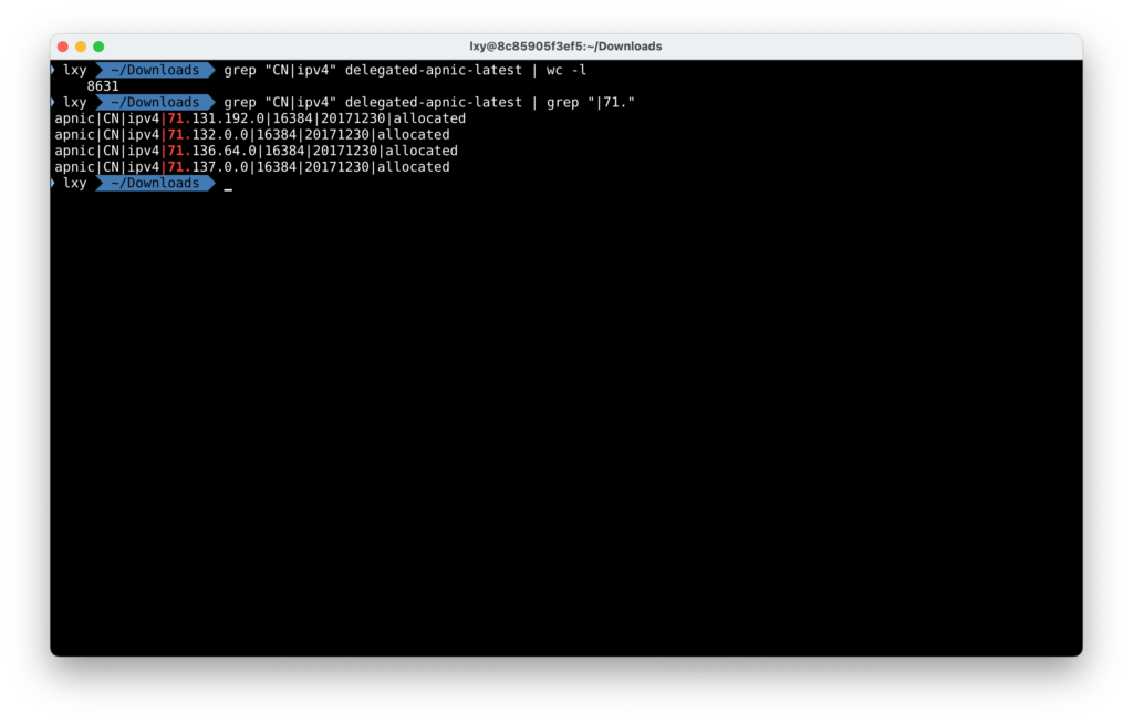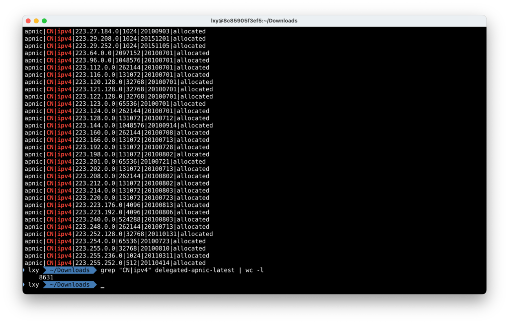 将这个文件下载到本地,然后可以在shell下检索其中的特定范围。可以看到中国区的IP地址分配总计8631个range。每个range根据大小,可能是C类地址段,也可能是B类地址段,其中包含的地址个数也有显示。如下截图。