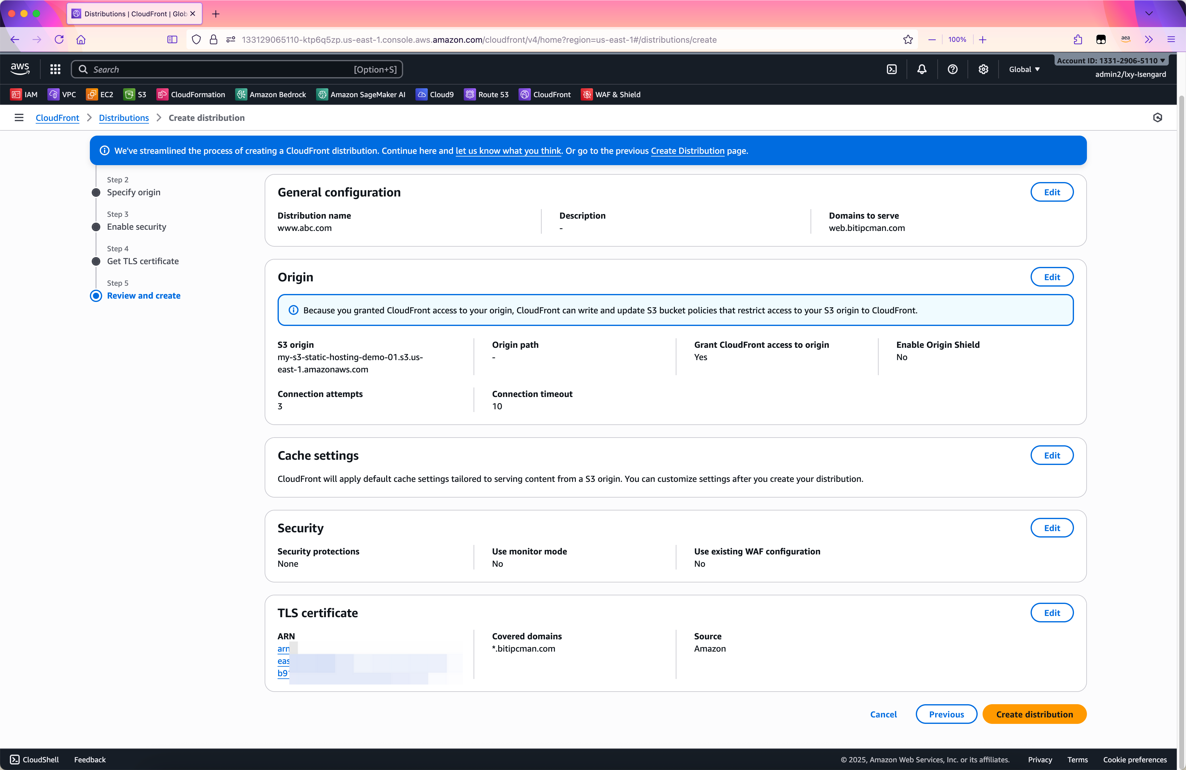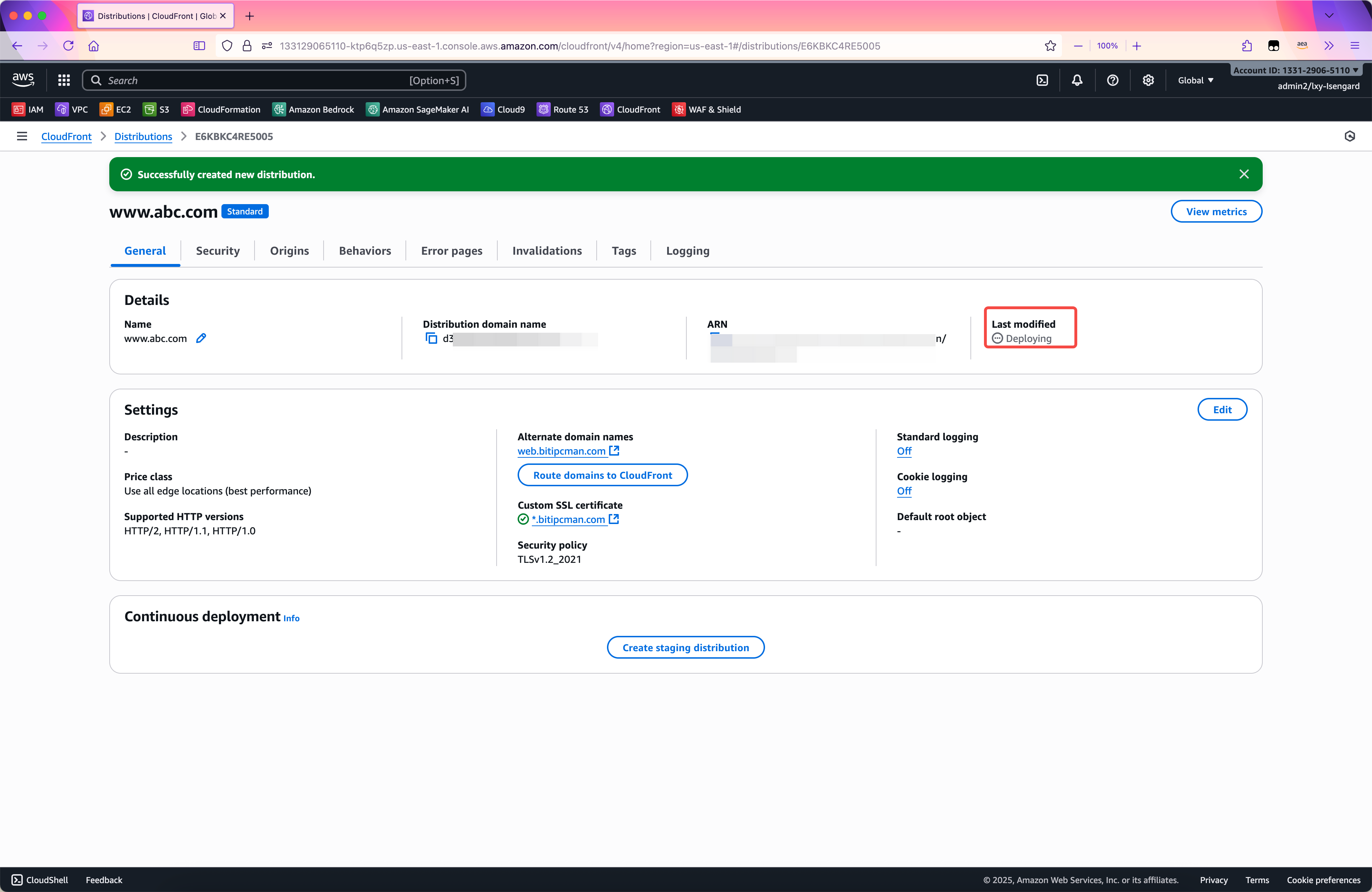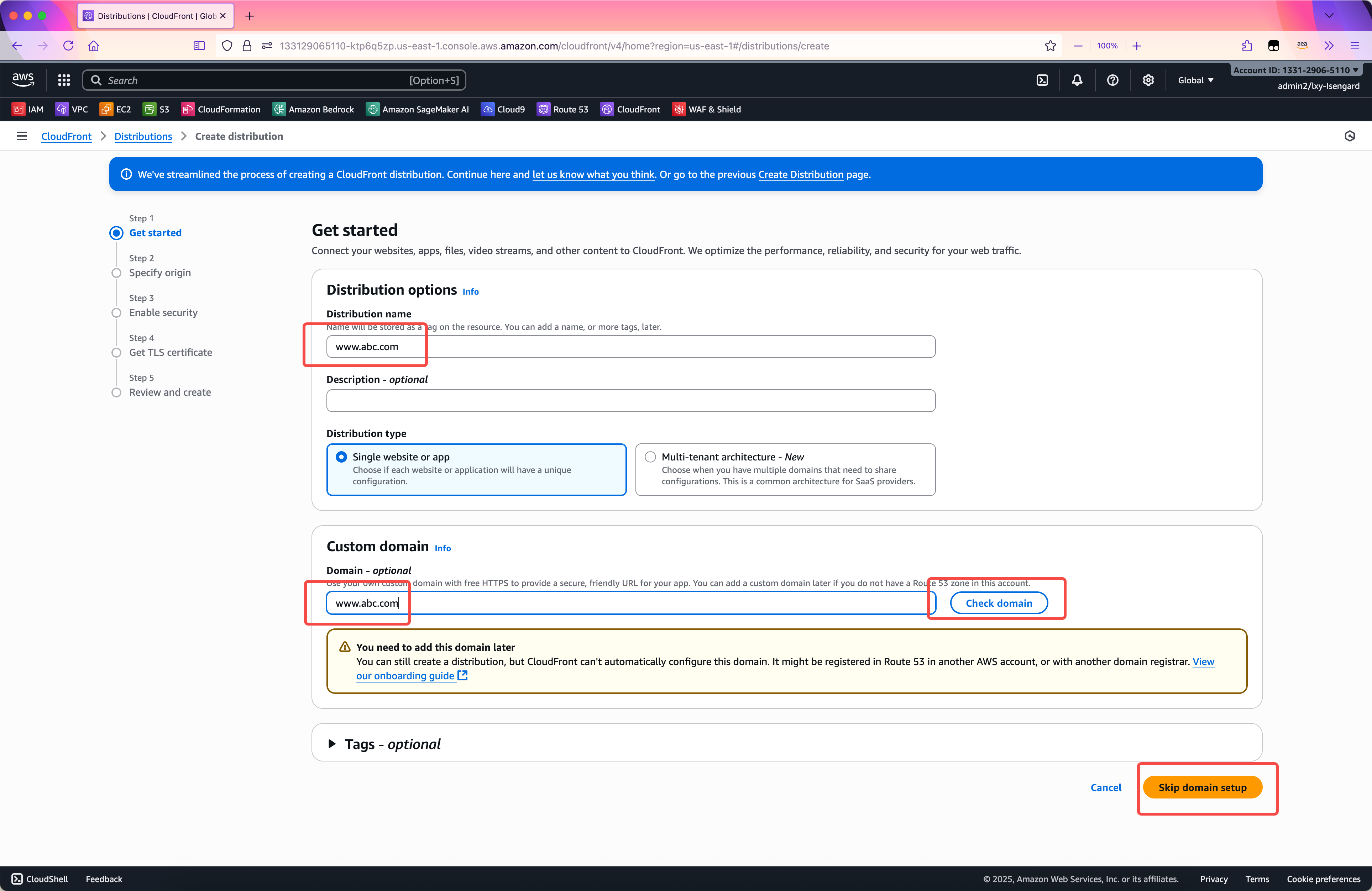 在上一步创建完成的界面上,可以看到Distribution domain name
