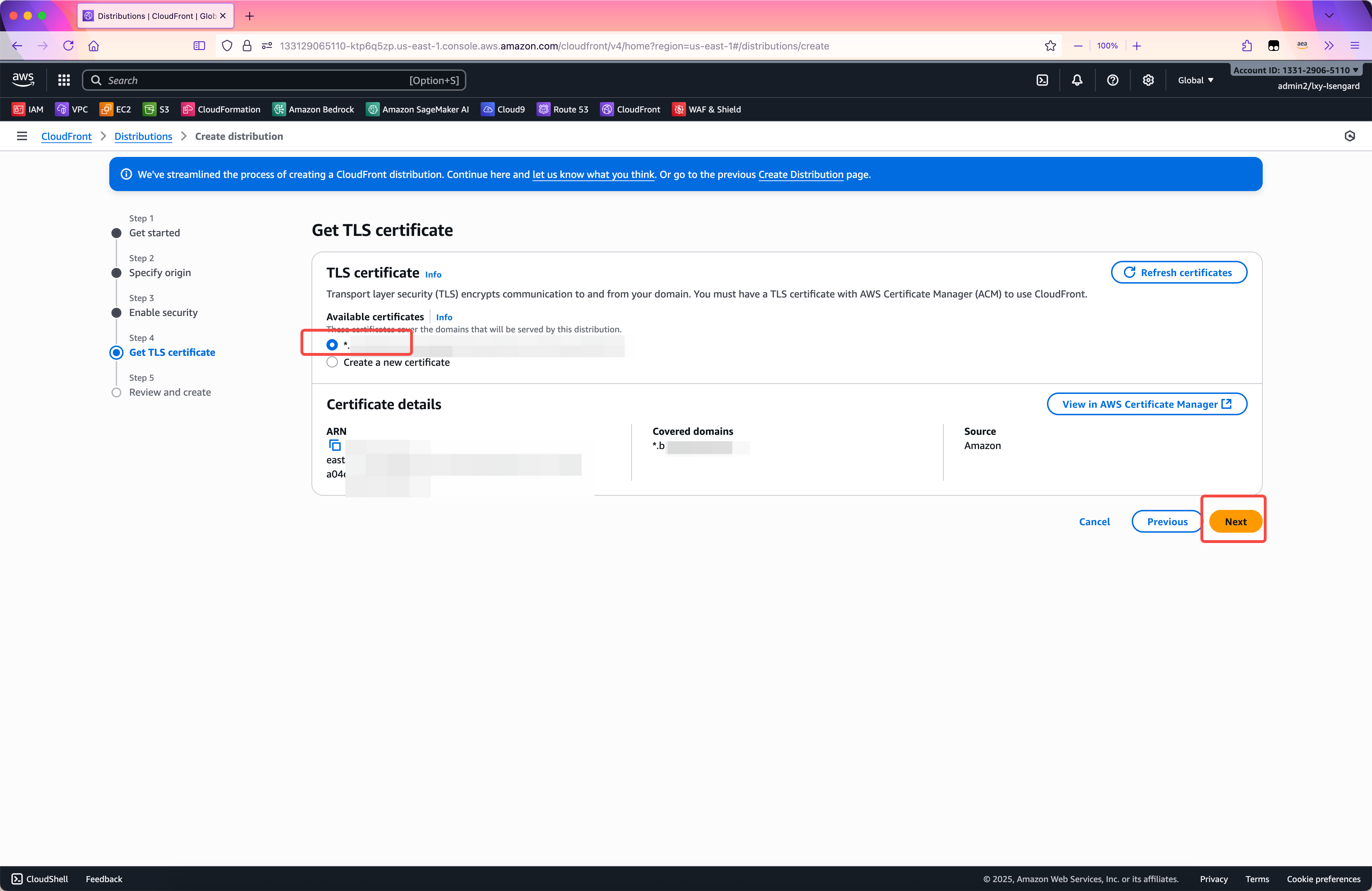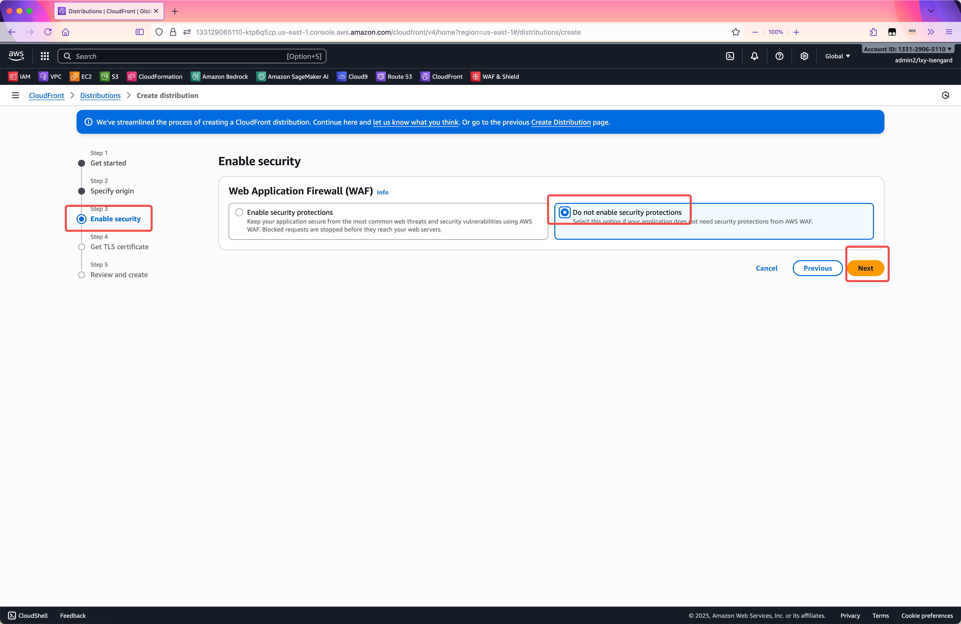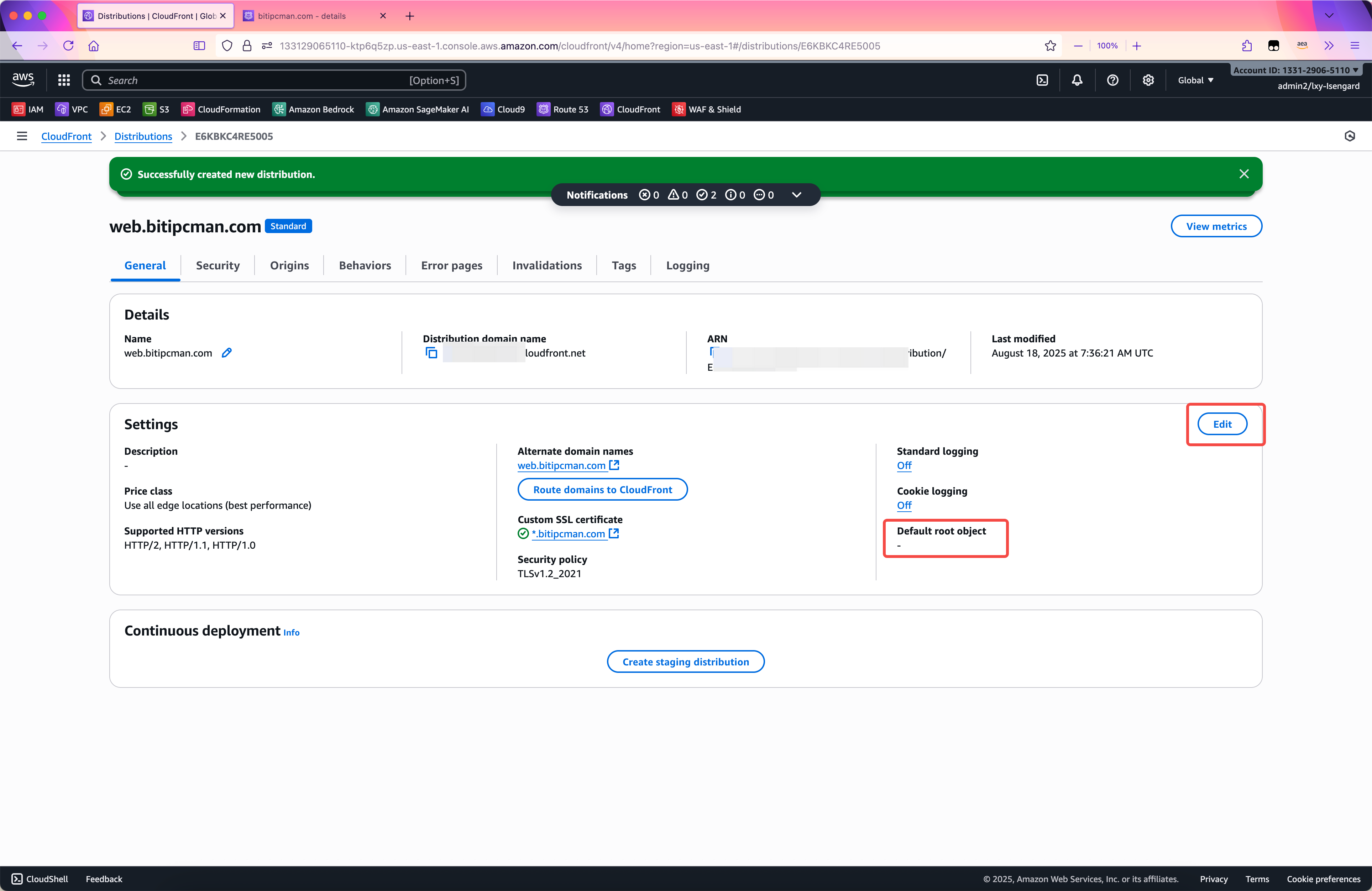 在上一步创建完成的界面上,可以看到Distribution domain name