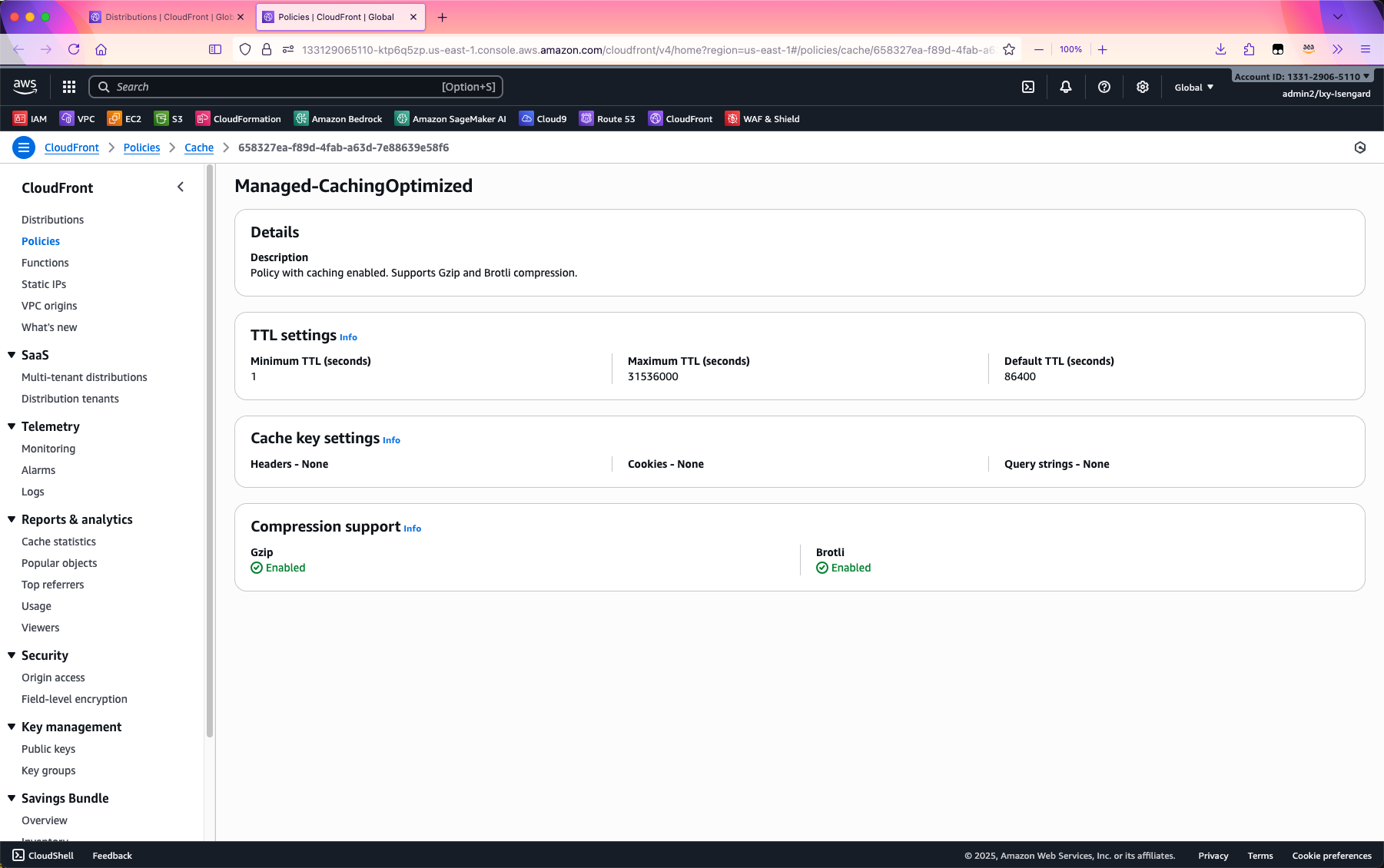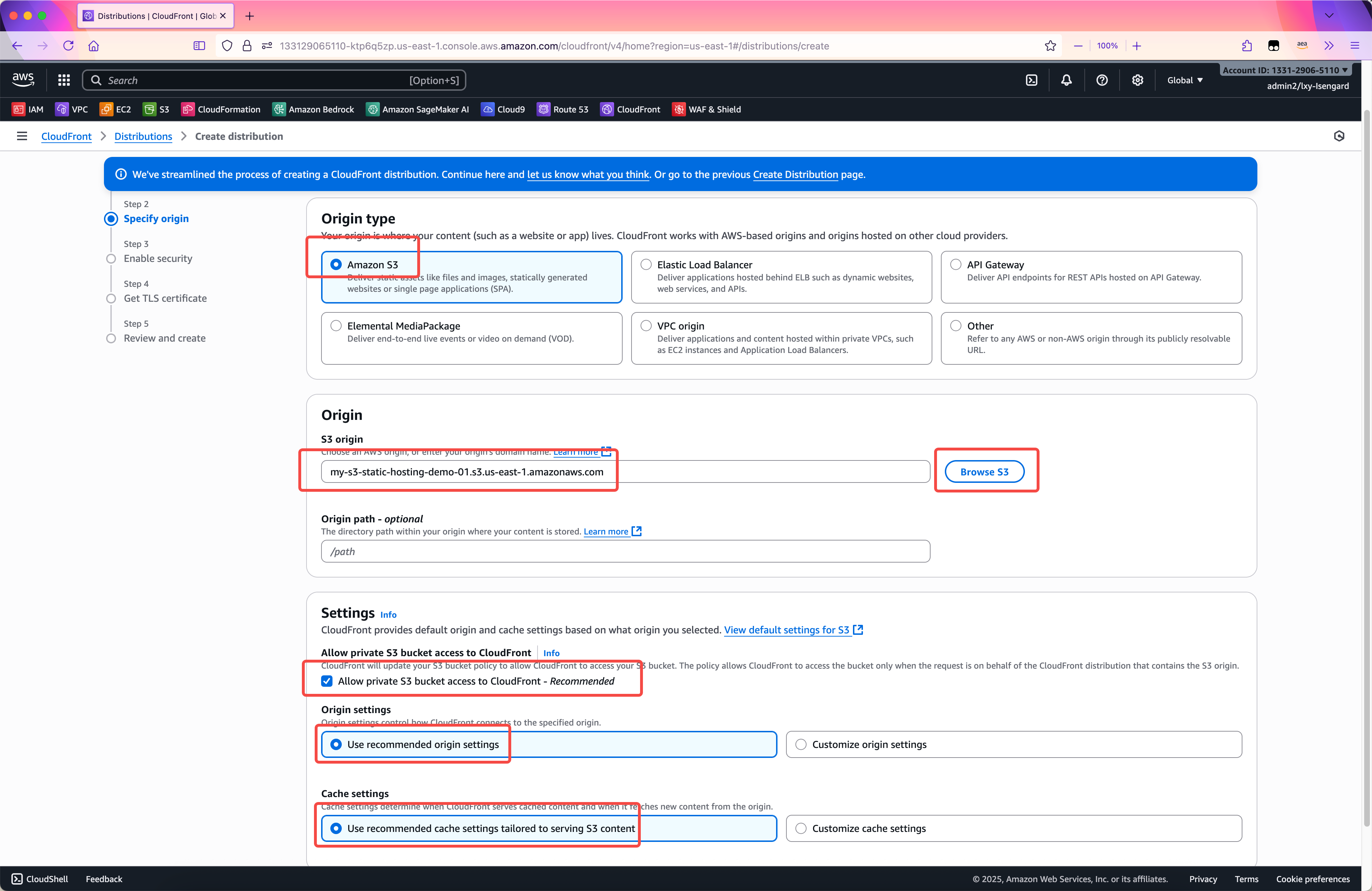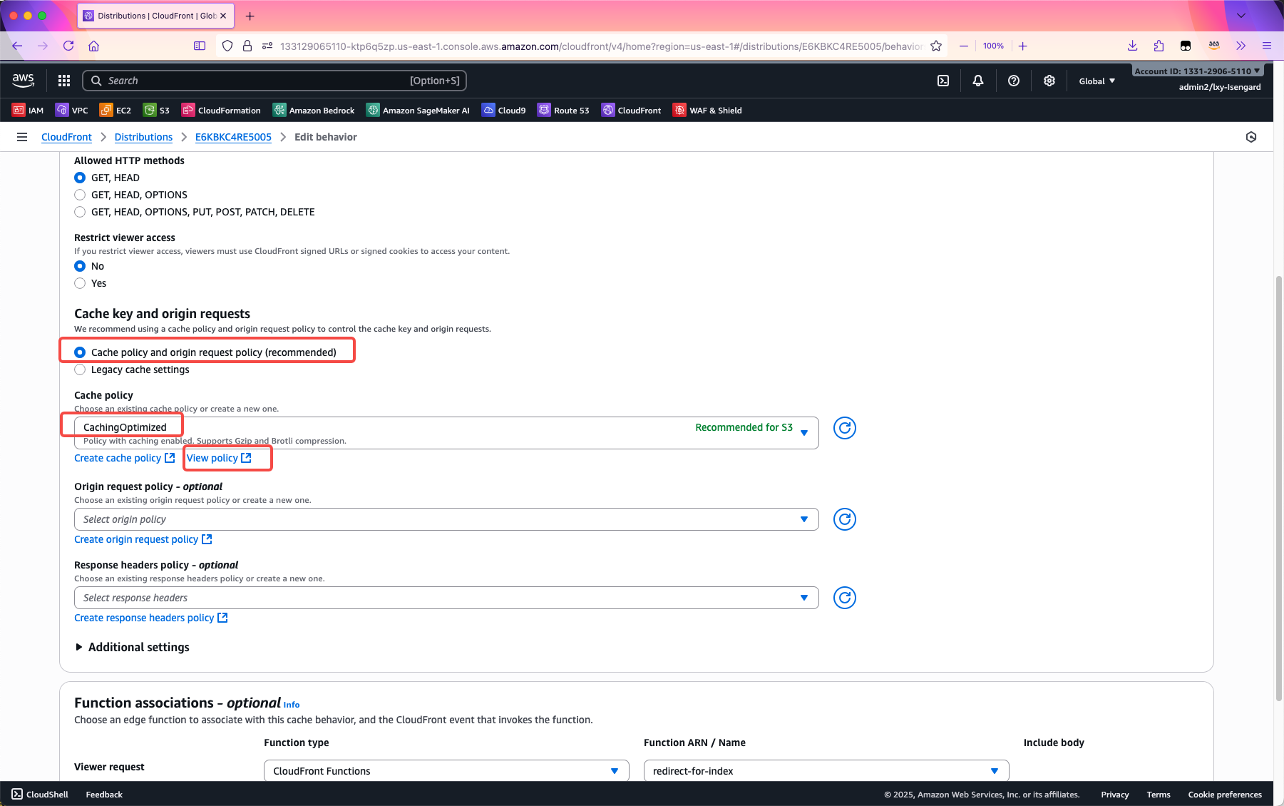 选项位置上,可看到CloudFront向导推荐的设置是Cache policy and origin request policy (recommended)
