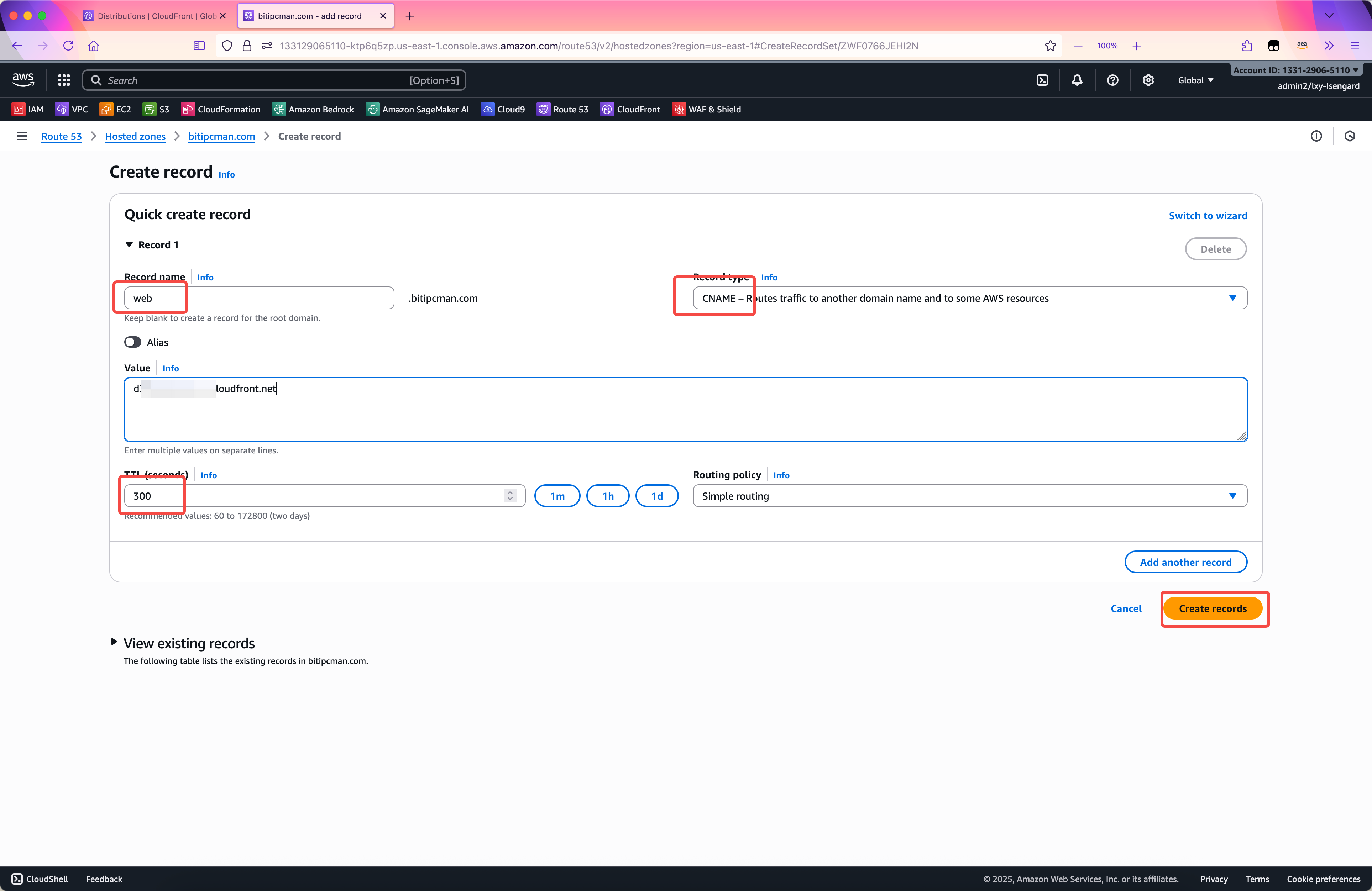 如果您的域名使用了Amazon Route53进行解析,那么以上的域名解析记录配置填写如下截图。