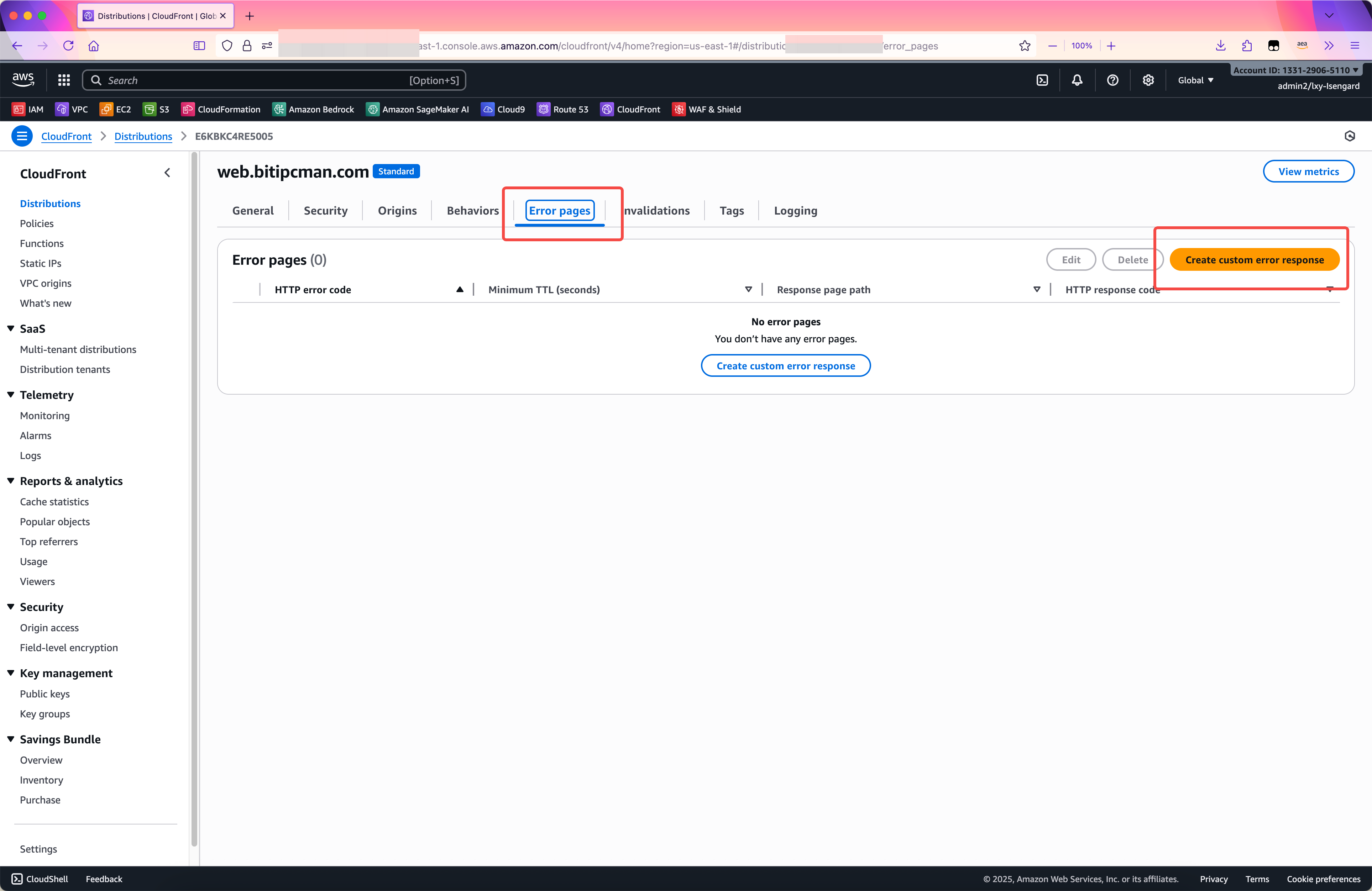 的错误。这个时候CloudFront返回的错误代码是403。这就是没有404错误的原因。如果不修改自定义错误页面的配置,当用户输入了错误地址时候,会显示没权限错误,可能引起访问者的误解,误以为是网站故障而不是自己输入错误的地址。