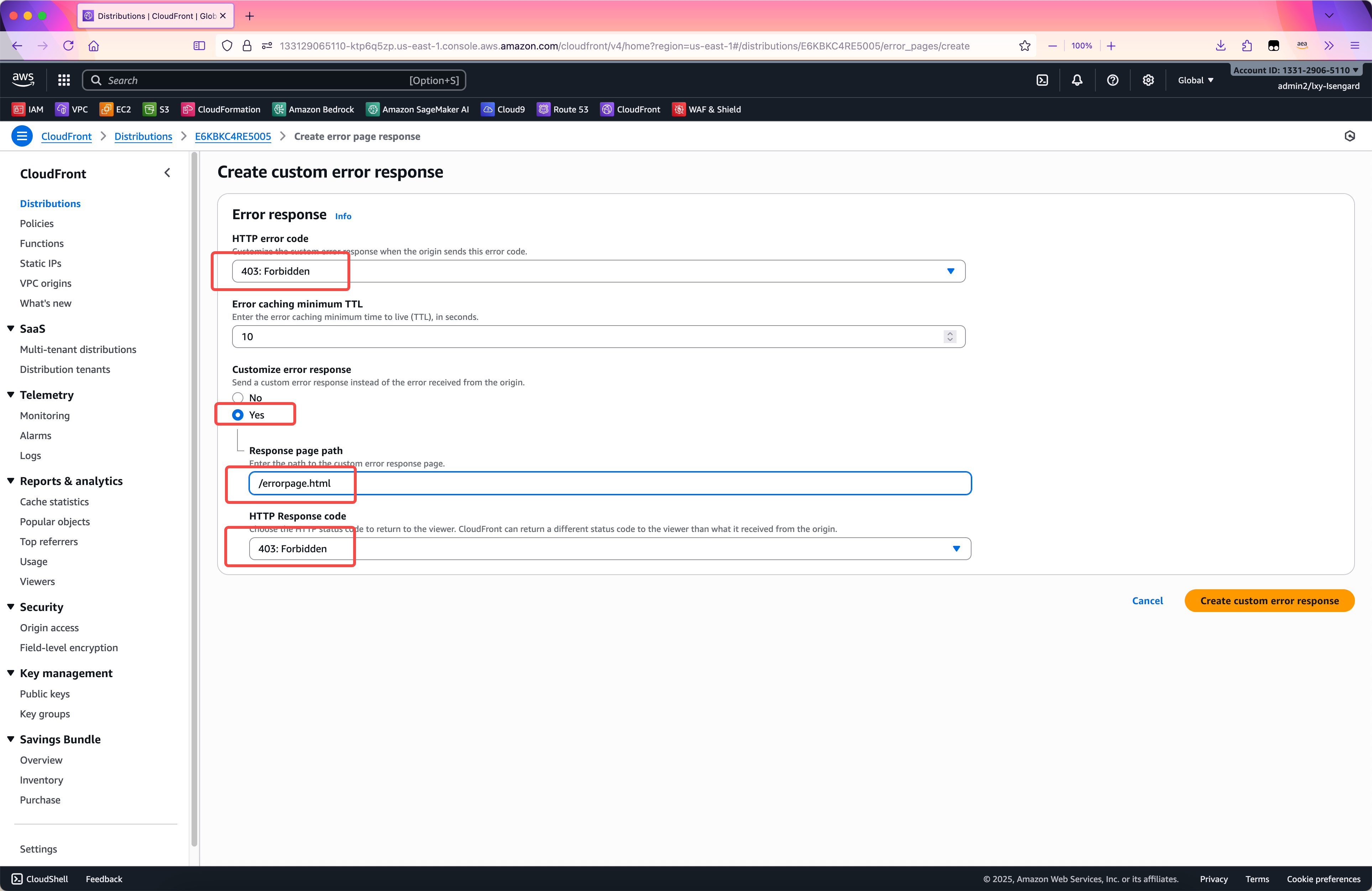 下拉框,首先选中403错误,然后将下方的Customize error response