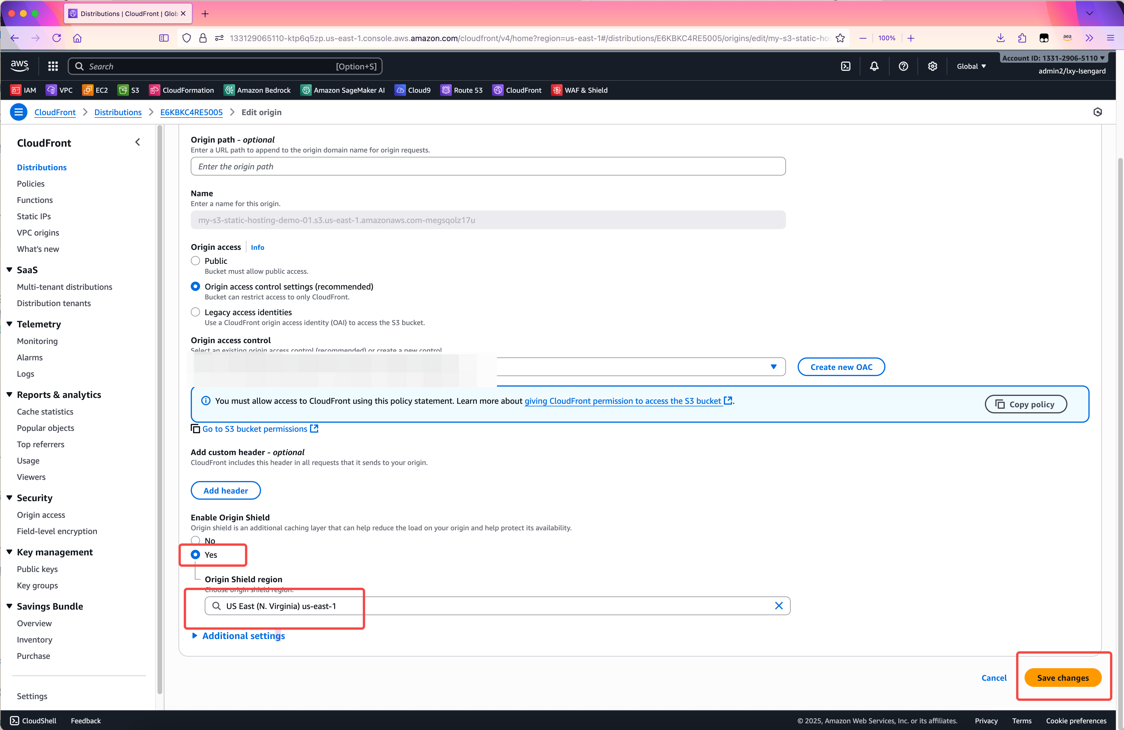 在源站设置界面,将页面移动到最下方,开启Origin Shield选项,然后将回源的区域改为和S3存储桶相同的区域。然后点击保存按钮。如下截图。