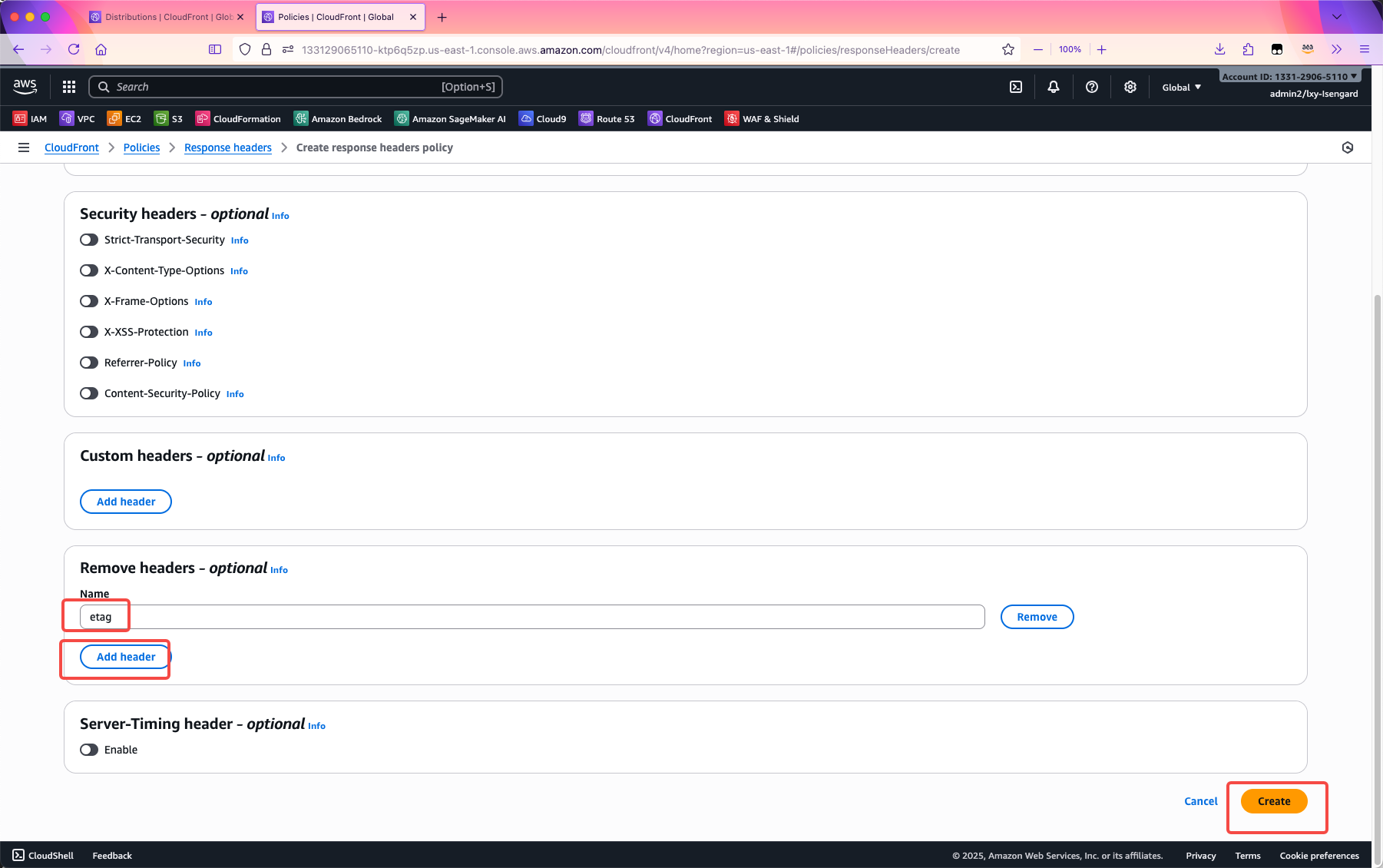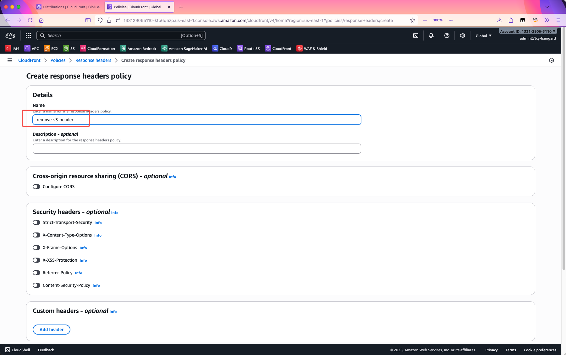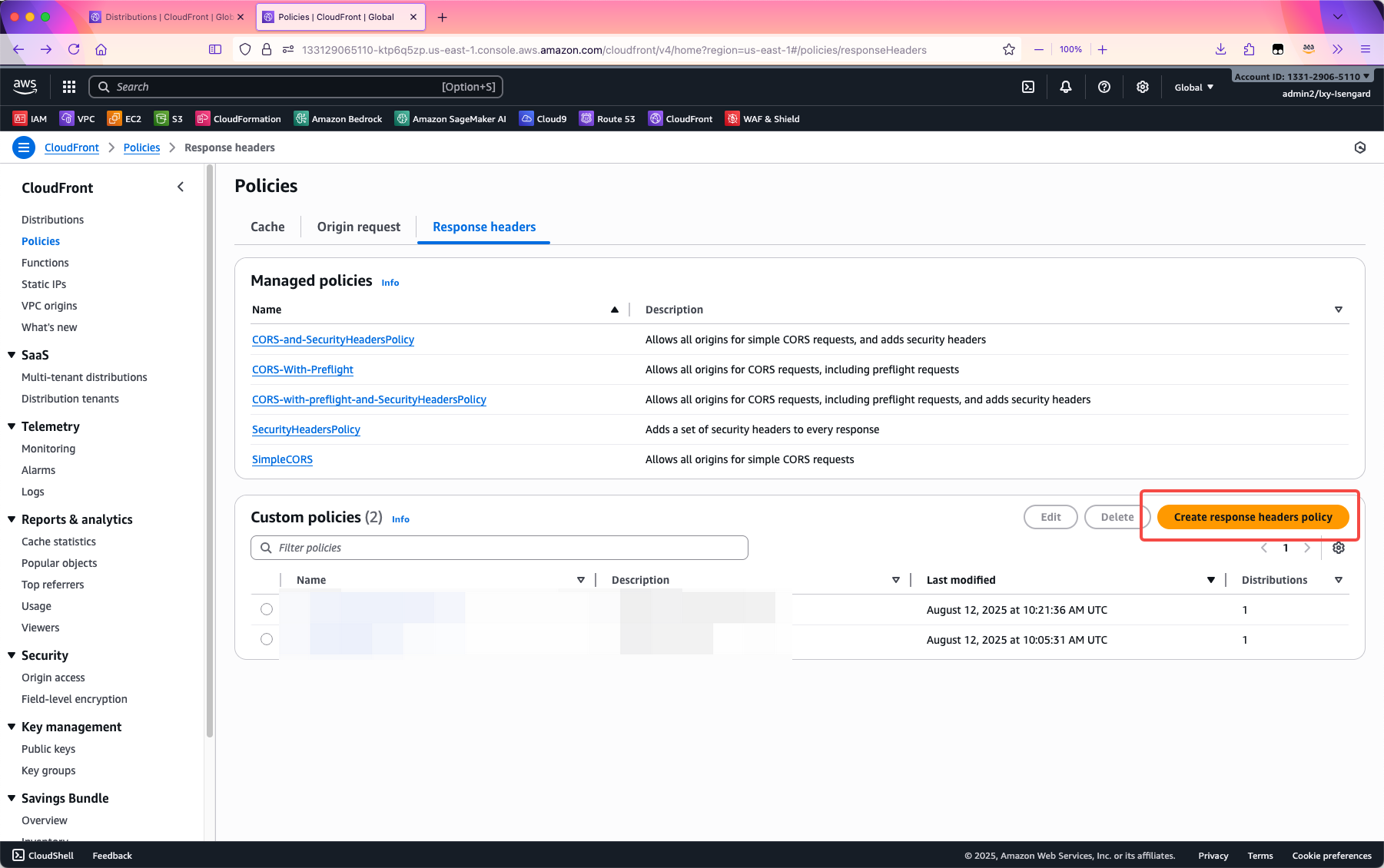 进入cloudFront的Policy规则界面,点击第三个标签页Response headers