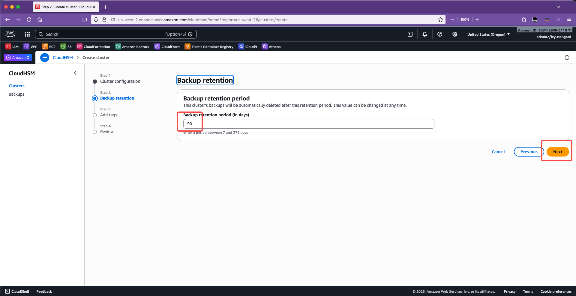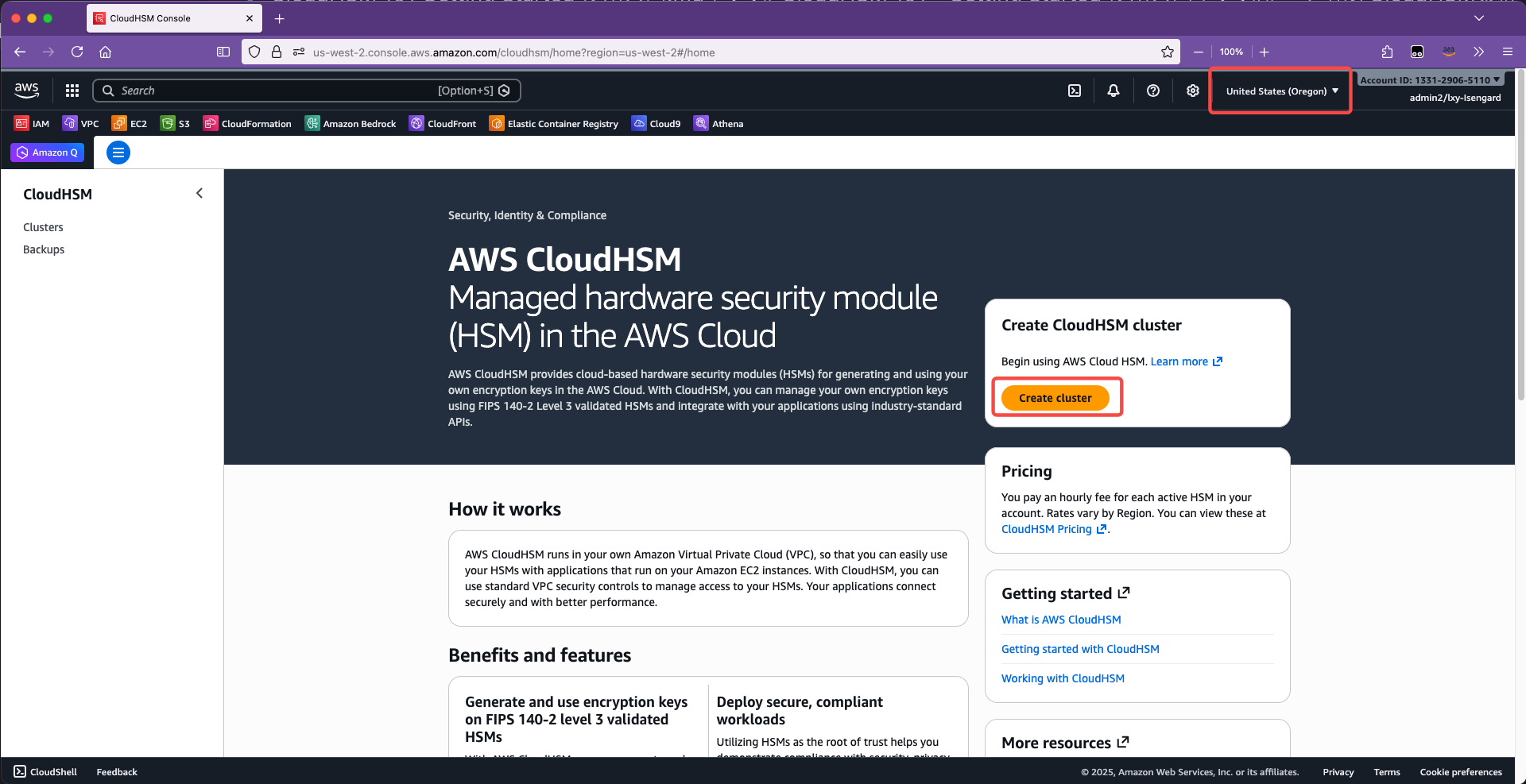 首先登录到AWS控制台,选择要部署CloudHSM的区域。然后进入CloudHSM服务界面,点击创建集群按钮。如下截图。