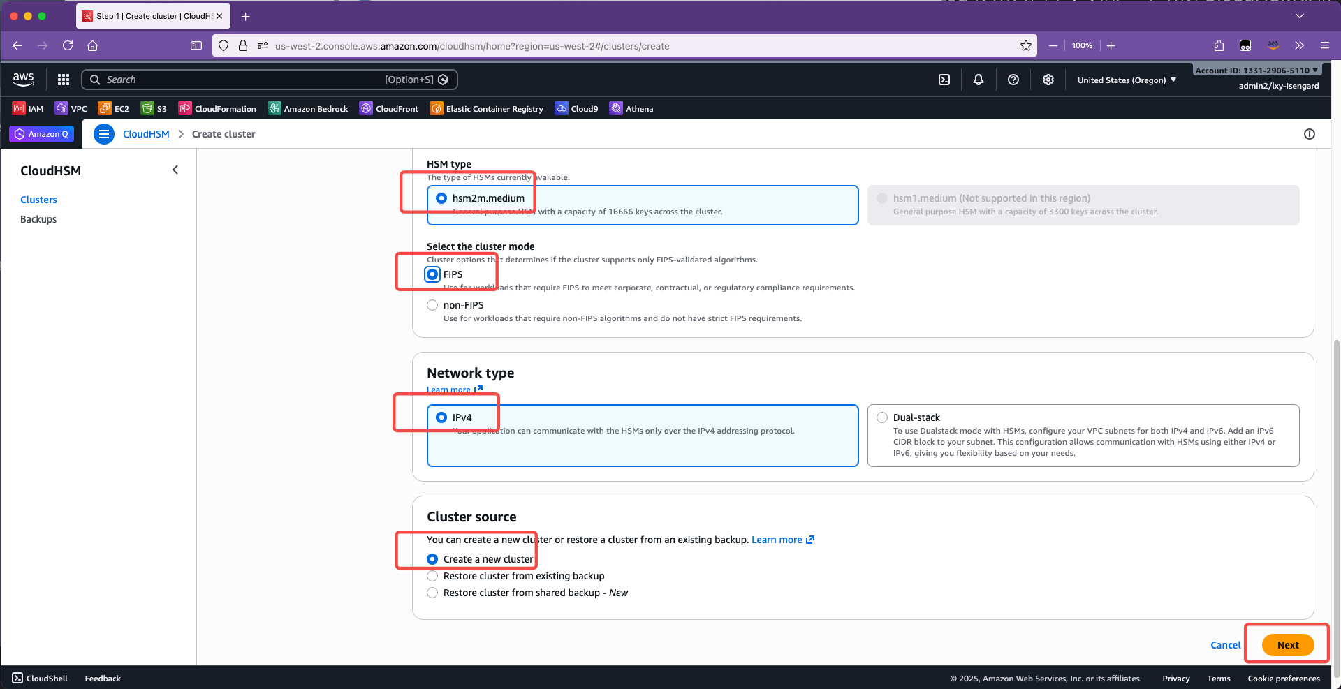 在设备机型选择中,当前仅提供唯一的机型hsm2m.medium,选择加密规范是FIPS规范,选择网络类型是IPv4,选择创建新的集群。如下截图。