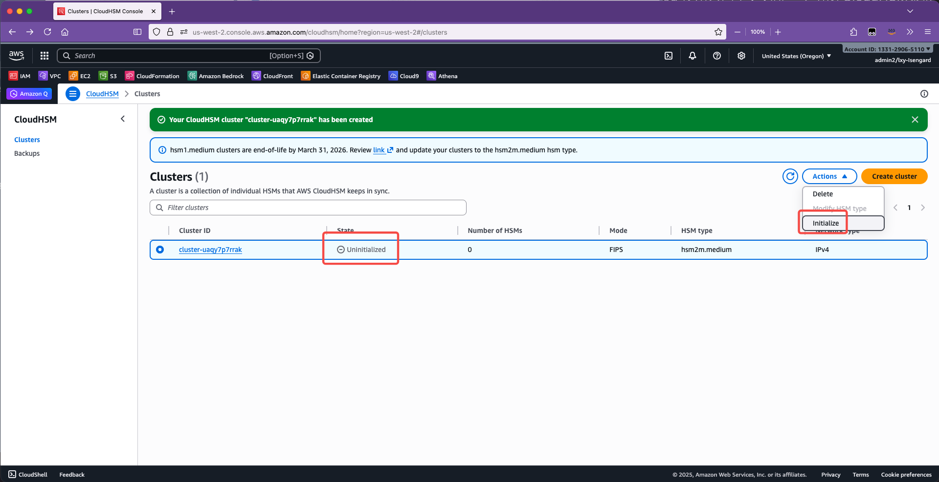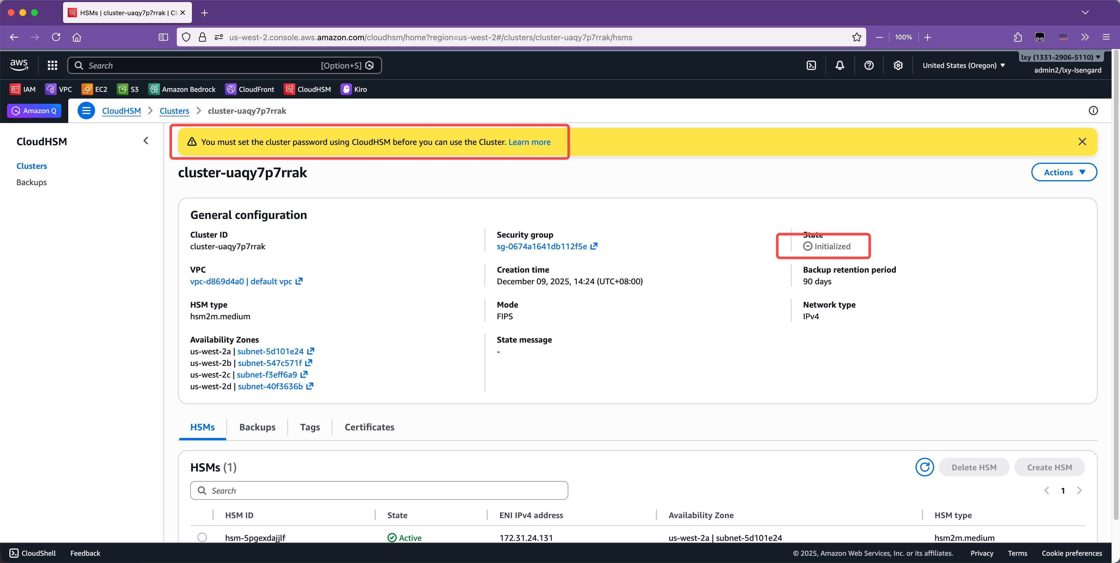 等待一段时间后,CloudHSM状态是已经初始化完成(Initialized),下一步是激活(如黄色提示)。如下截图。