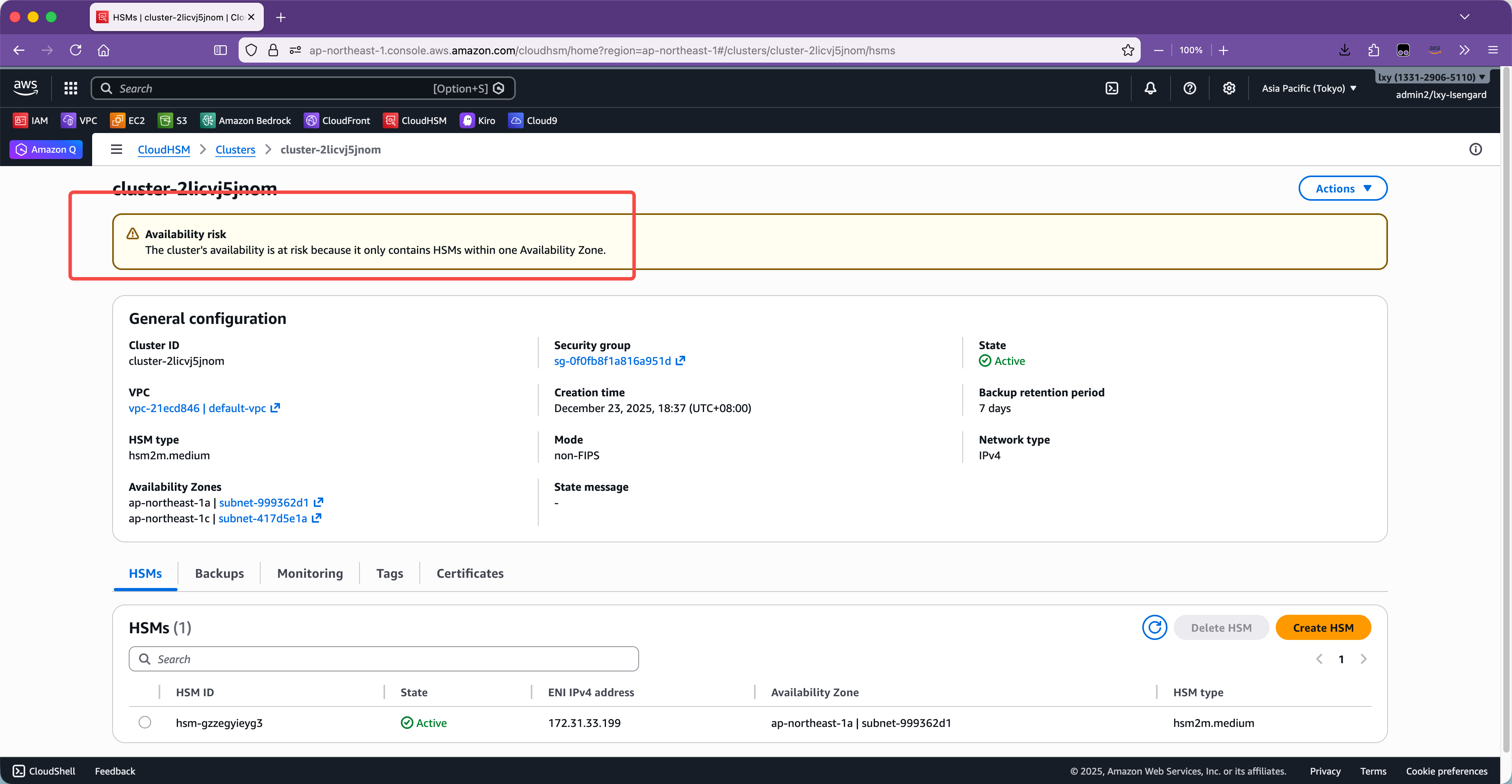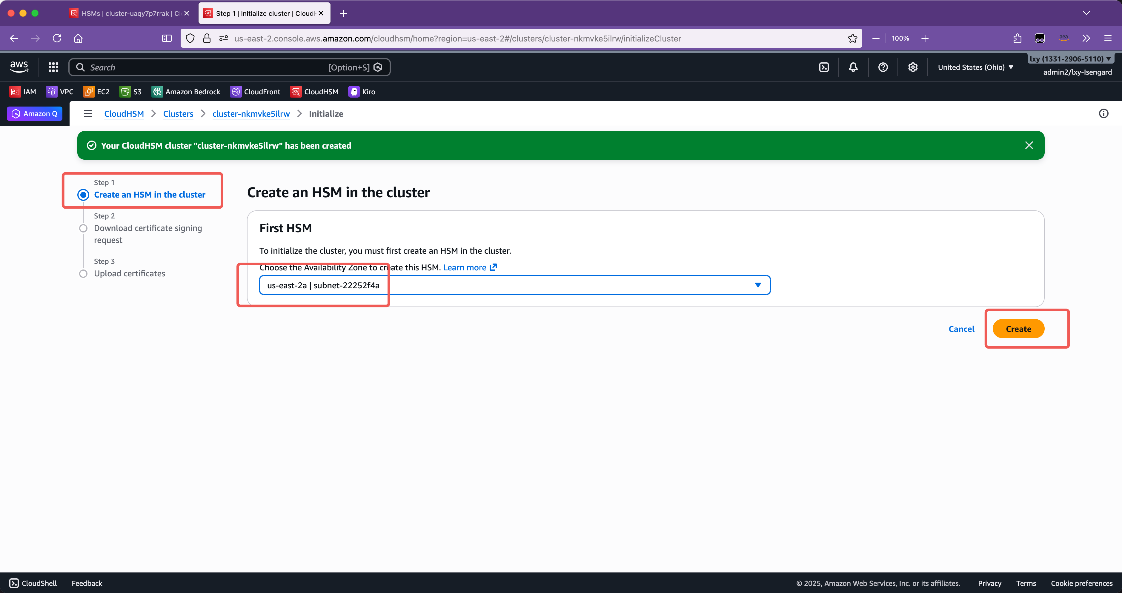 点击右下角的Create CloudHSM按钮。然后选择另一个可用区,并点击创建按钮。