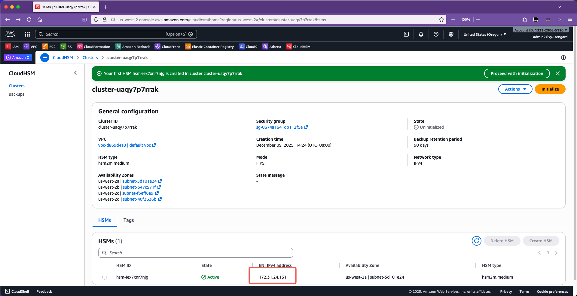 初始化完毕后,还要复制出来CloudHSM的IP地址(在页面下方的ENI IPv4 Address),下一步CLI连接将会使用。