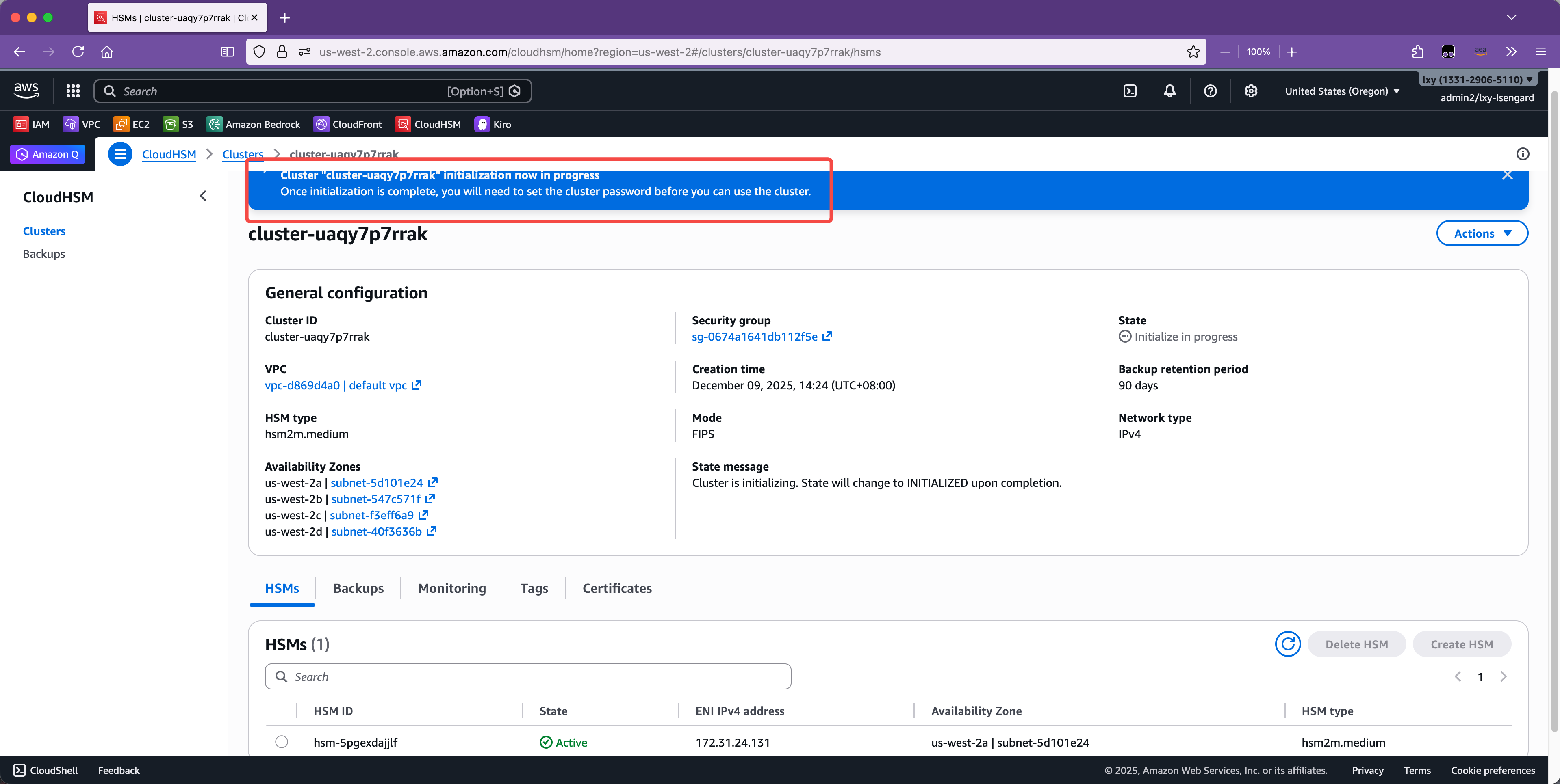 创建集群完成。刚创建好的集群是未初始化状态,集群里可用的CloudHSM加密机数量是0,要发起初始化。