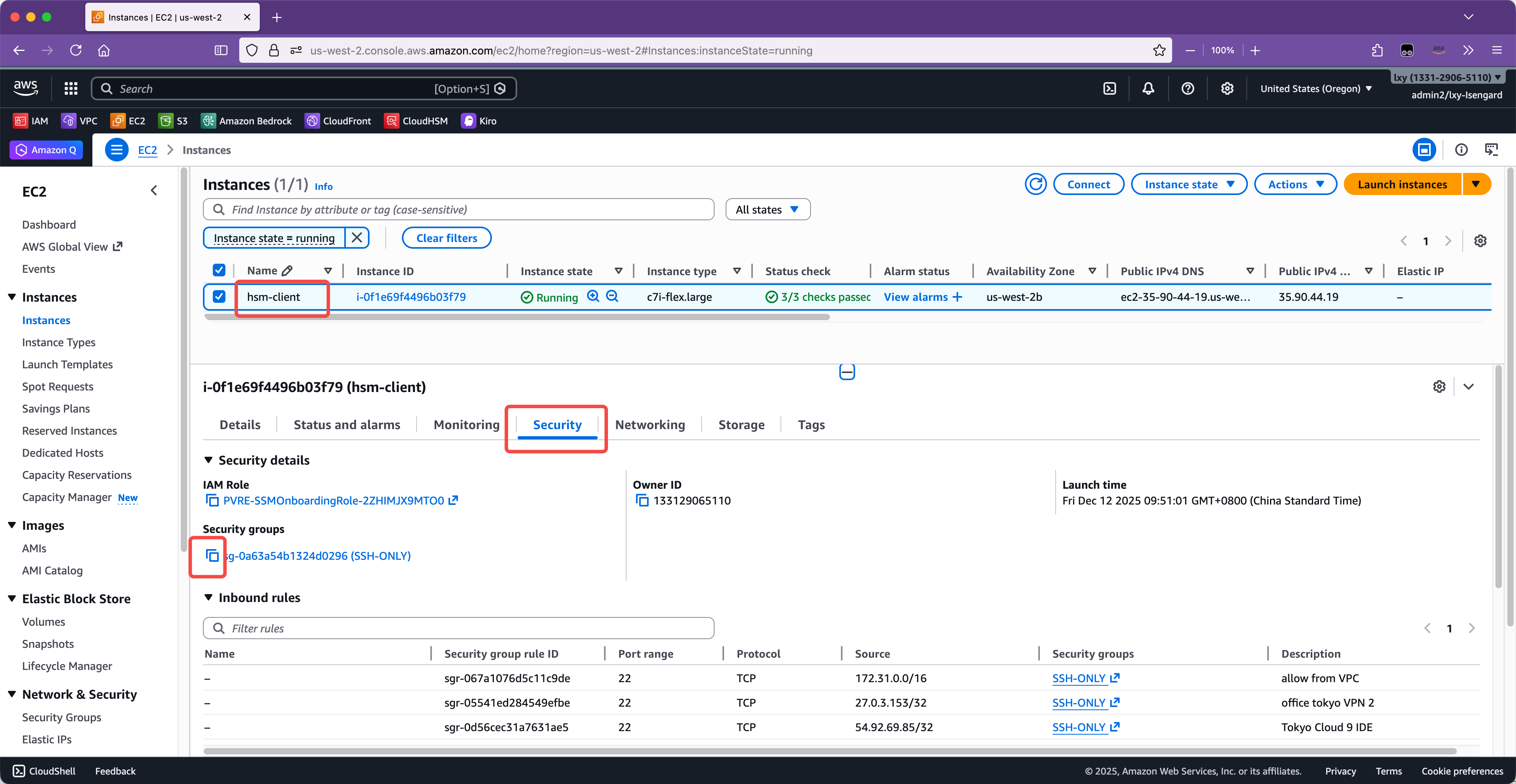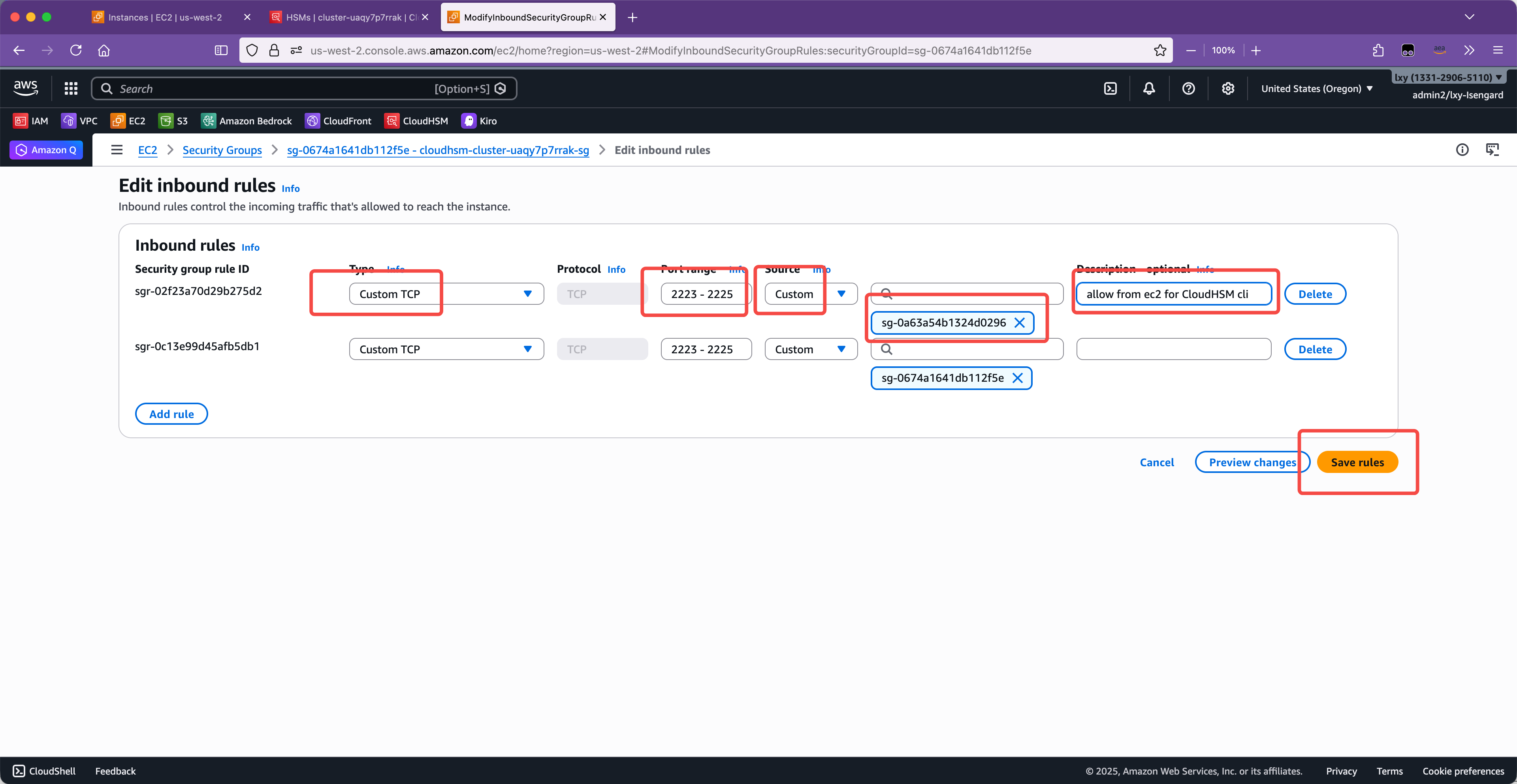 在发起CloudHSM CLI连接之前,还需要放行CloudHSM的安全规则组的入站请求。操作方法是,先找到当前作为管理机/跳板机的EC2的安全组,复制下来安全组的ID,然后再找到CloudHSM用的安全规则组,添加一条放行规则。