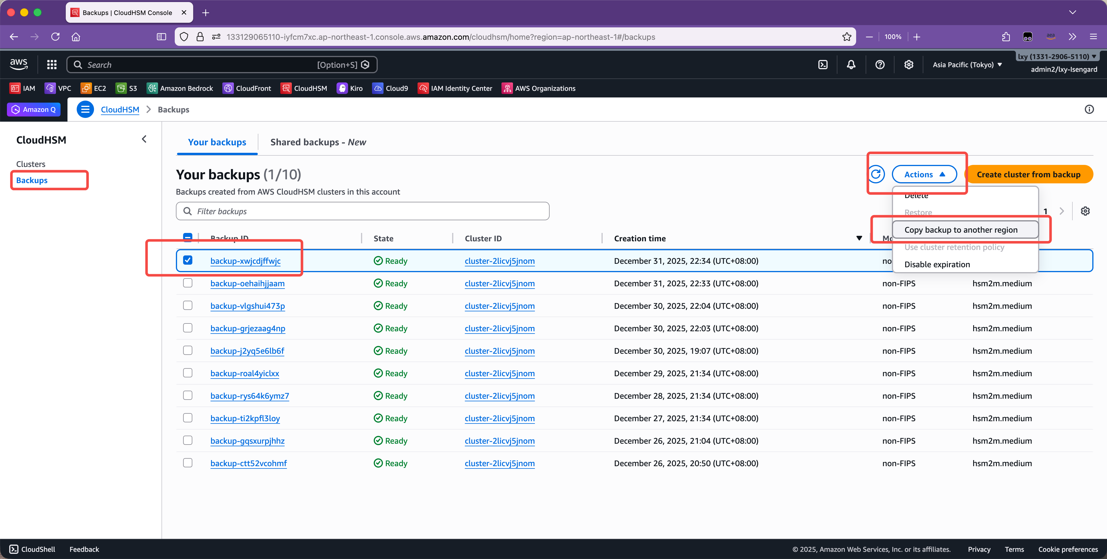 通过CloudHSM控制台手工执行备份的方法是,进入控制台,点击左下角的Backup备份按钮,从右侧选中要复制的备份,点击行动,从下拉框中选择跨区域复制。如下截图。