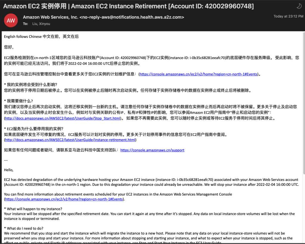 当EC2底层运行环境出现故障可能在未来一段时间影响EC2运行时候,AWS会发送系统降级的通知给用户,此时账户的注册邮箱可能会收到如下邮件。