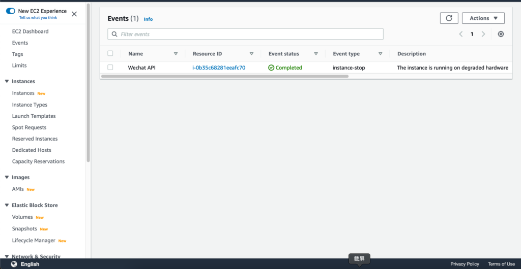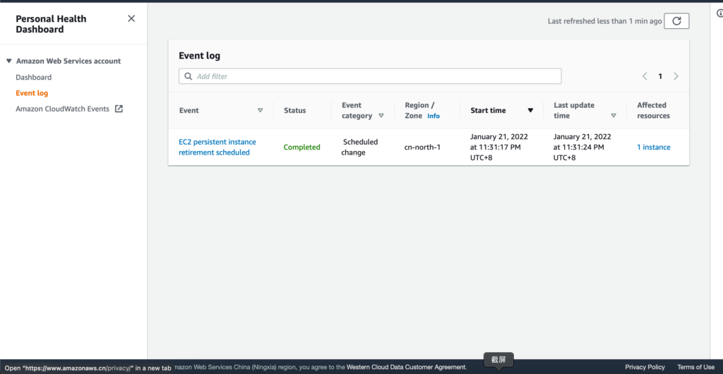 这个时候,可进入Personal Health Dashboard模块,或者进入EC2左边第二项菜单事件中,可看到硬件降级的通知。如下截图。