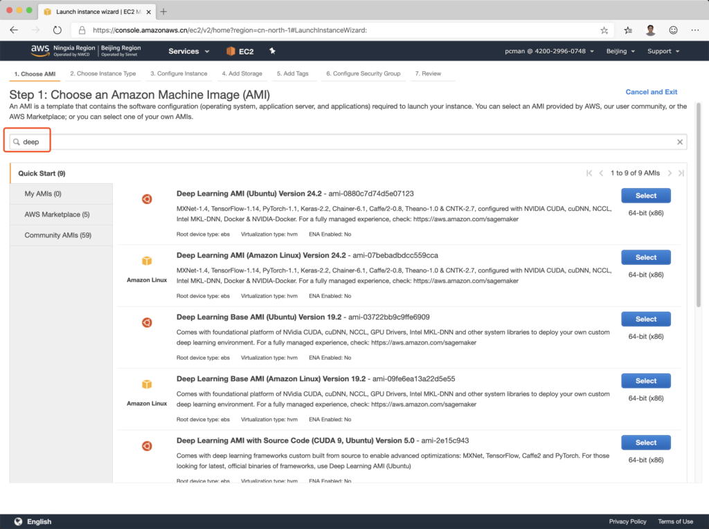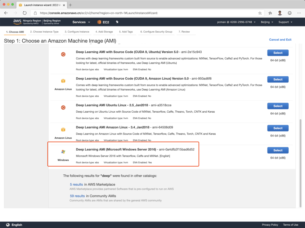 如果是机器学习场景,请使用AMI镜像中的deep learning镜像,Windows和Linux版本都可以。镜像会预装好多个机器学习框架,做到开箱即用。在创建实例的时候,可以选择输入关键字来搜索镜像。如下截图。