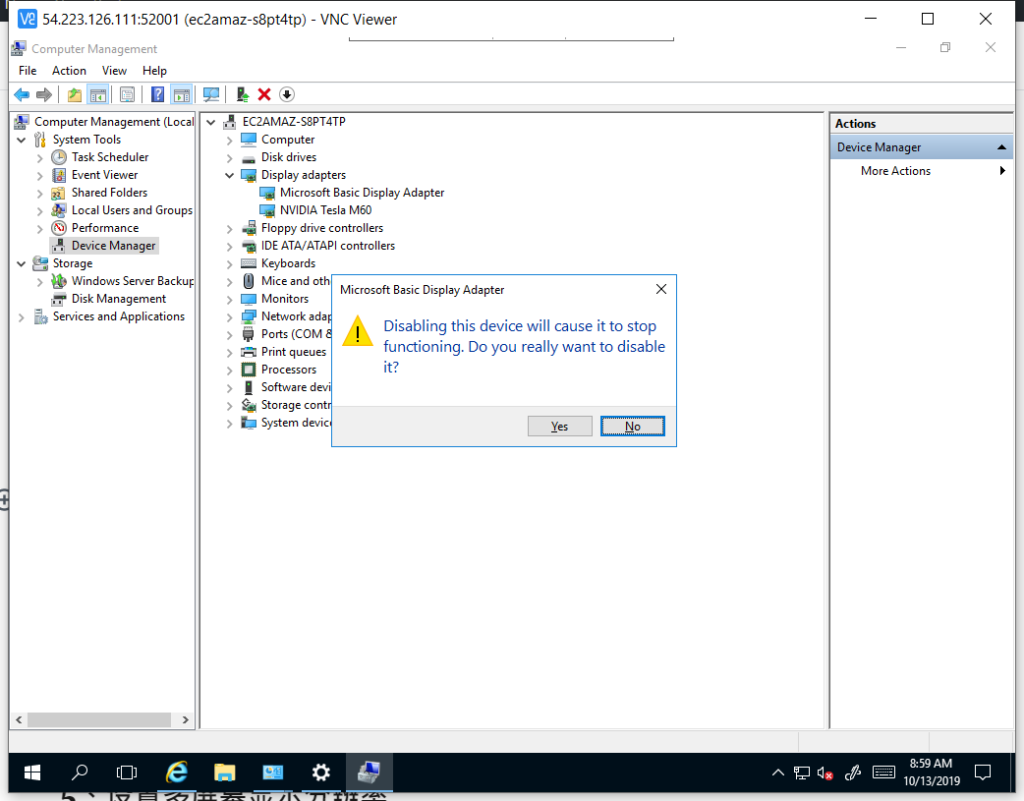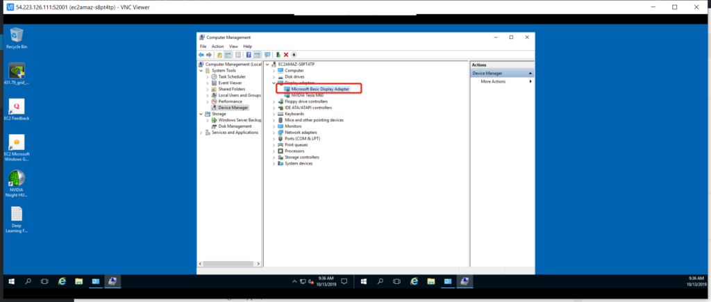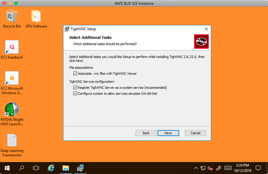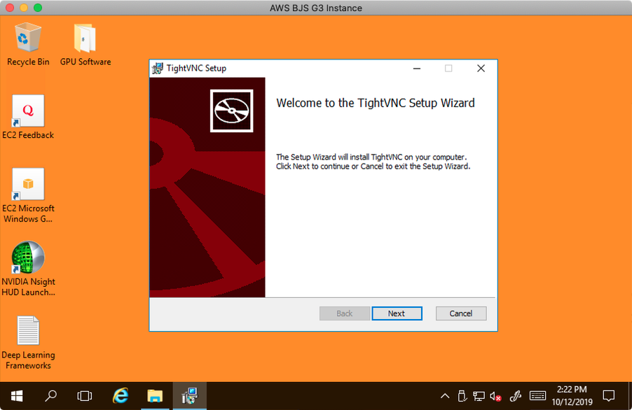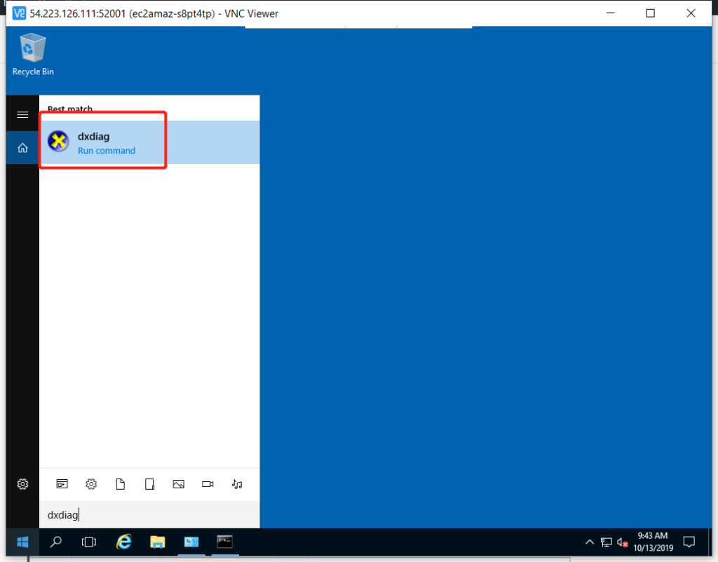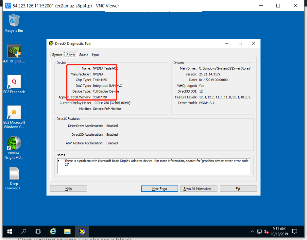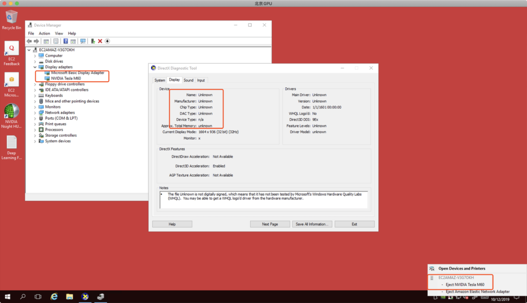 如上截图展示的信息,已经是基于一个Deep Learning Windows Server 2016的AMI了,已经是包含了基础Nvidia驱动的版本。从设备管理器中可以看到M60加速卡,从右下角插拔设备中可以看到M60。但是运行检查3D设备的命令 dxdiag 是并不能正常显示的。这是因为RDP使用的显示驱动是WDDM,并不支持3D加速。因此,就需要部署VNC了。