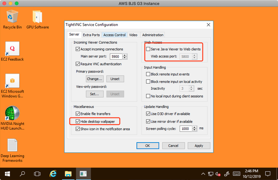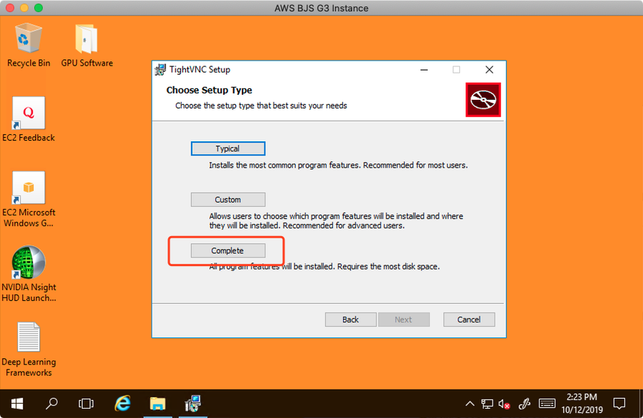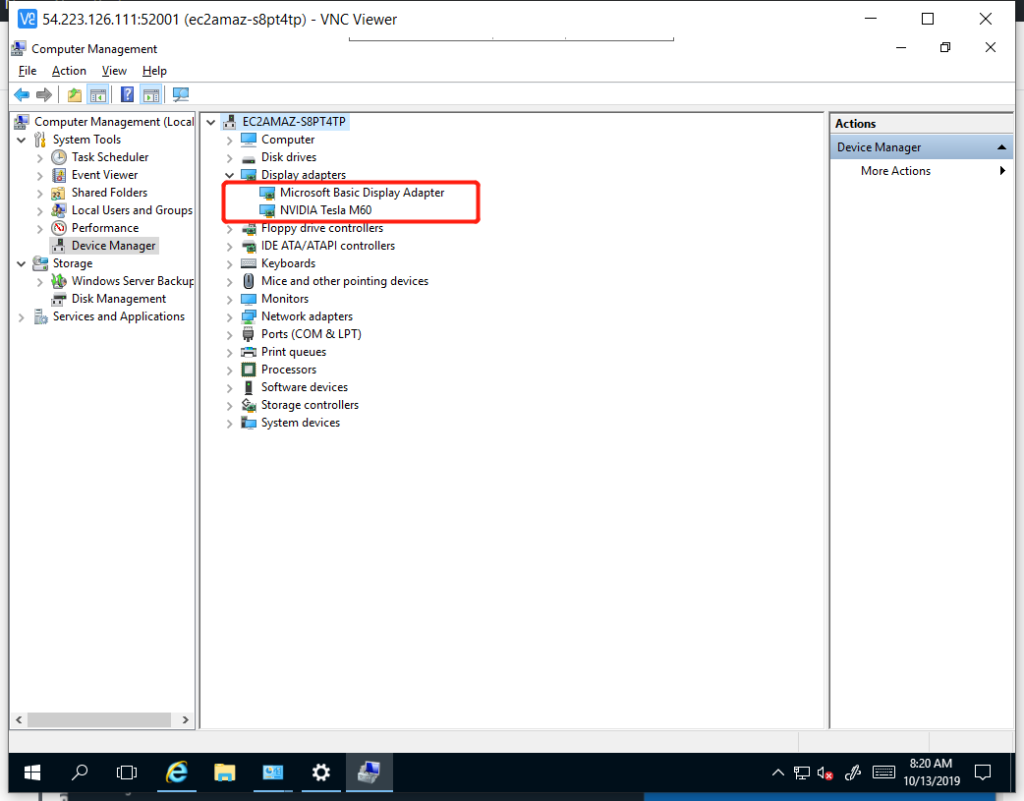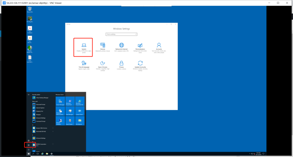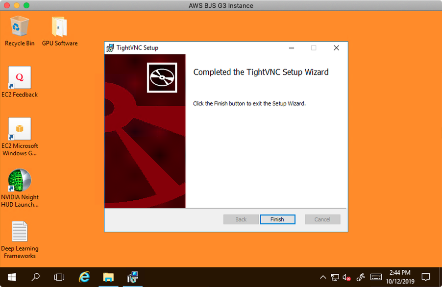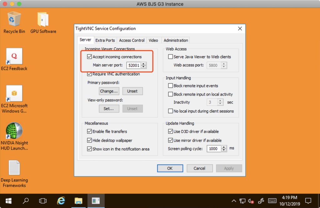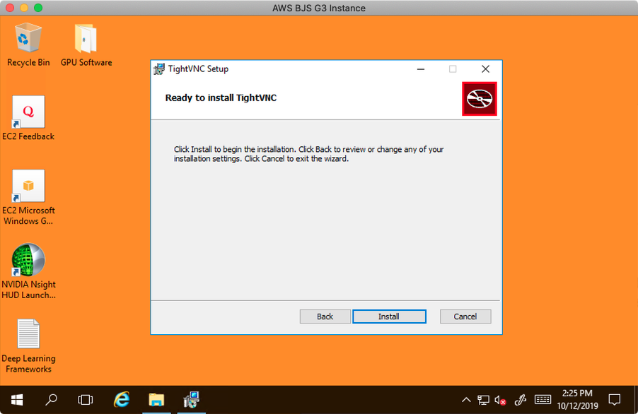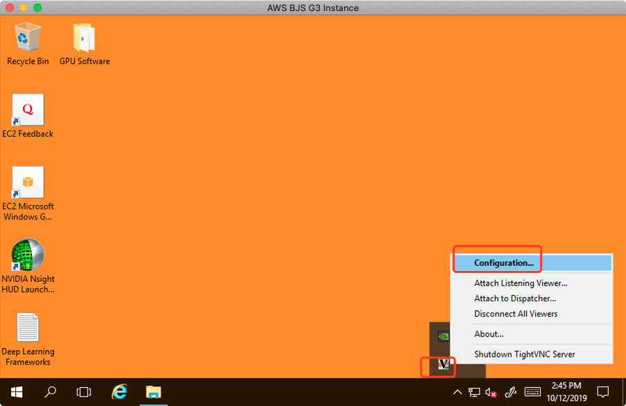 如上截图展示的信息,已经是基于一个Deep Learning Windows Server 2016的AMI了,已经是包含了基础Nvidia驱动的版本。从设备管理器中可以看到M60加速卡,从右下角插拔设备中可以看到M60。但是运行检查3D设备的命令 dxdiag 是并不能正常显示的。这是因为RDP使用的显示驱动是WDDM,并不支持3D加速。因此,就需要部署VNC了。