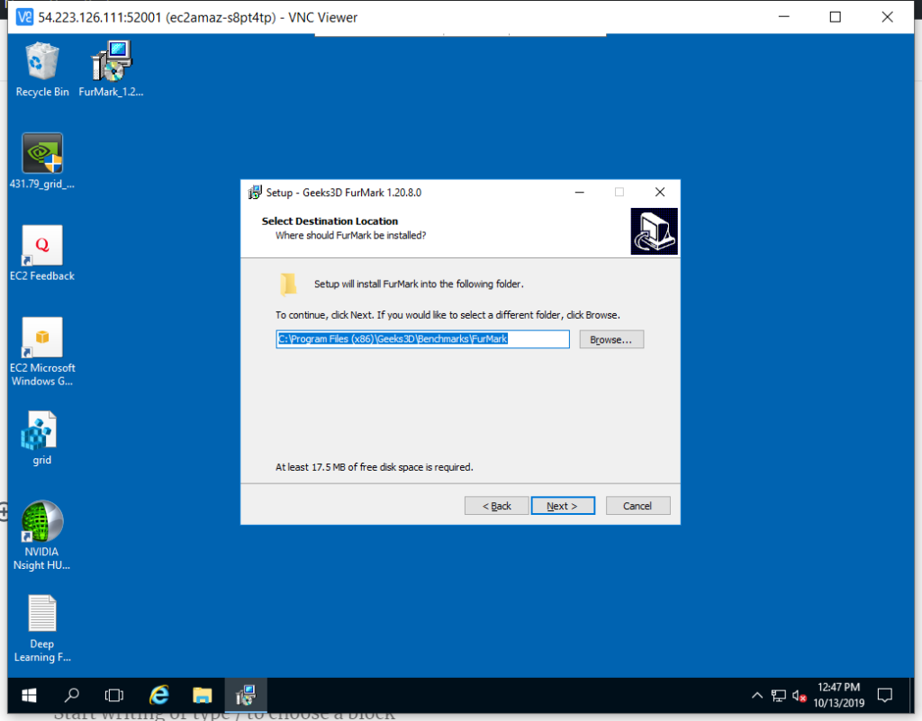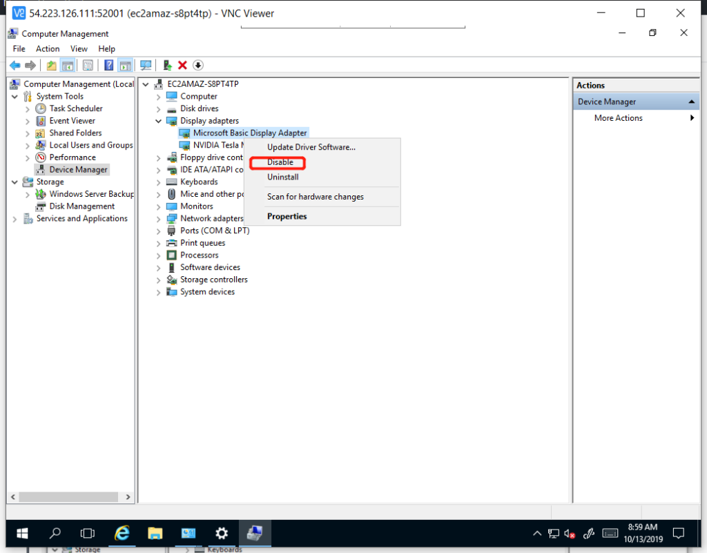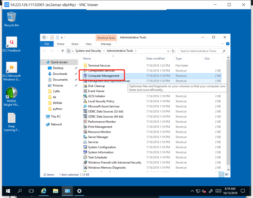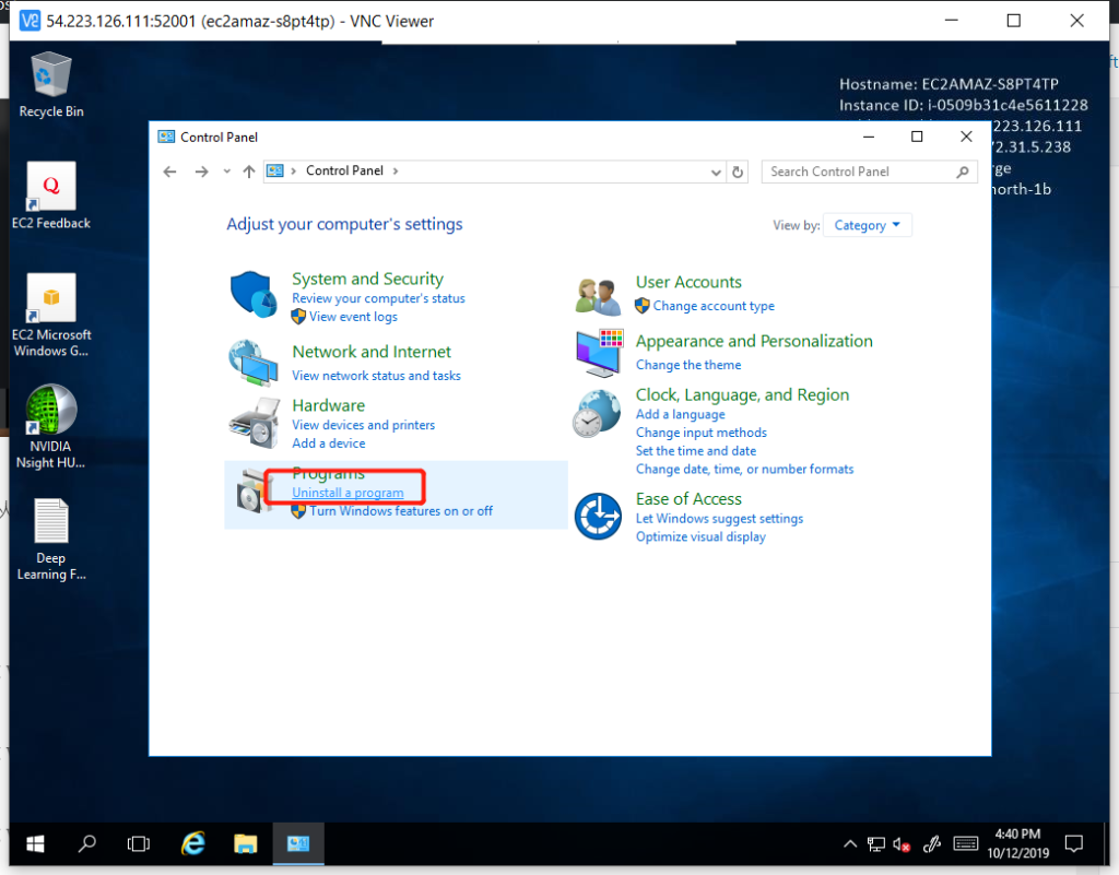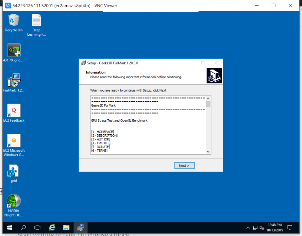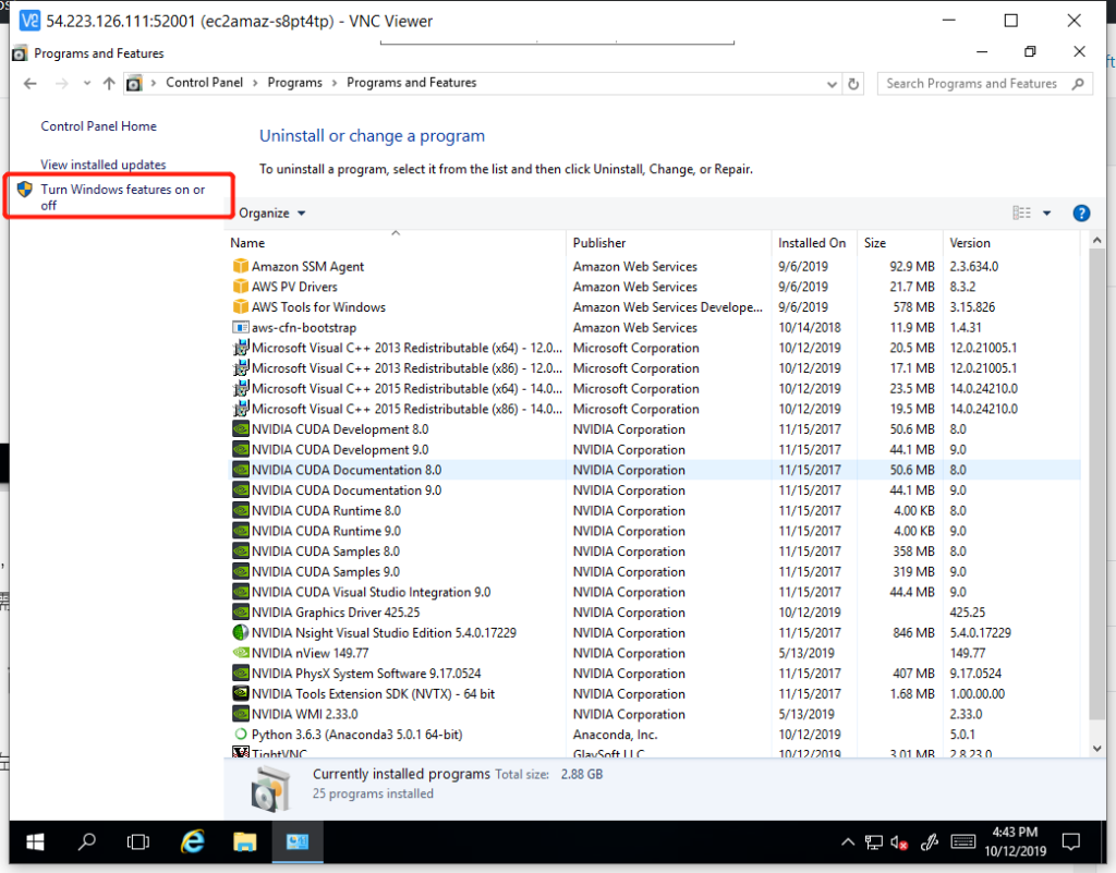 如上截图展示的信息,已经是基于一个Deep Learning Windows Server 2016的AMI了,已经是包含了基础Nvidia驱动的版本。从设备管理器中可以看到M60加速卡,从右下角插拔设备中可以看到M60。但是运行检查3D设备的命令 dxdiag 是并不能正常显示的。这是因为RDP使用的显示驱动是WDDM,并不支持3D加速。因此,就需要部署VNC了。