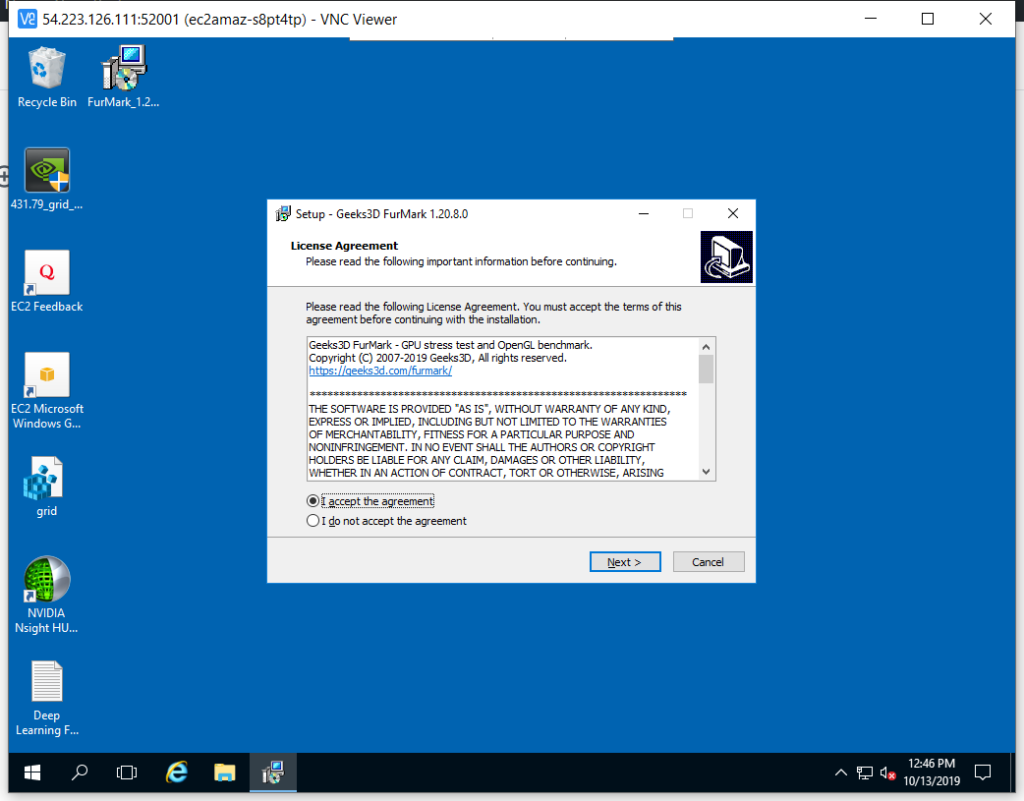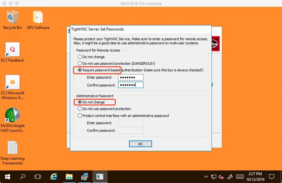 另外需要注意的是,由于微软的RDP版本默认是不支持3D加速的,因此针对3D图形的操作,需要更换其他远程管理工具,开源的有VNC,商用的有Teradici的PC-Over-IP,Citrix的ICA,NICE Desktop Cloud Virtualization(DCV)等。本使用开源的VNC为例做配置。