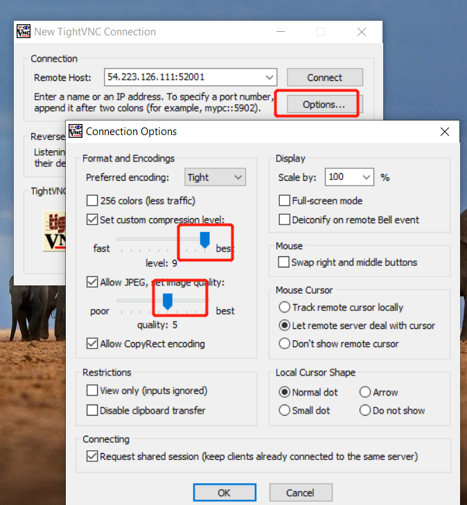 在TightVNC客户端上,要想达到比较好的传输效果,可以在发起连接前,点击设置按钮。把压缩设置为9,把图像质量设置到5。如下截图。