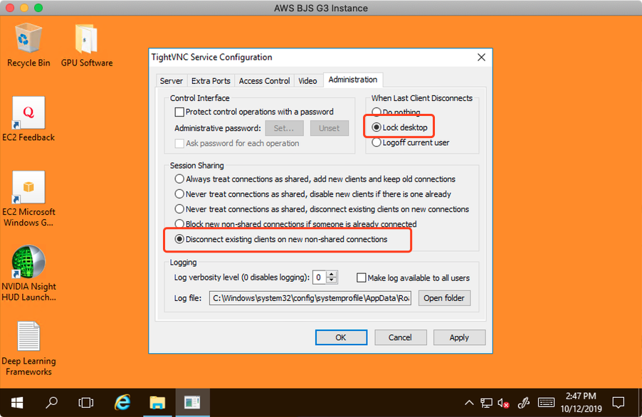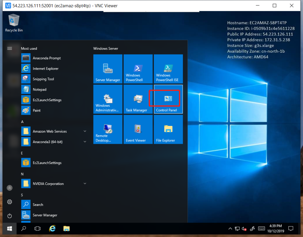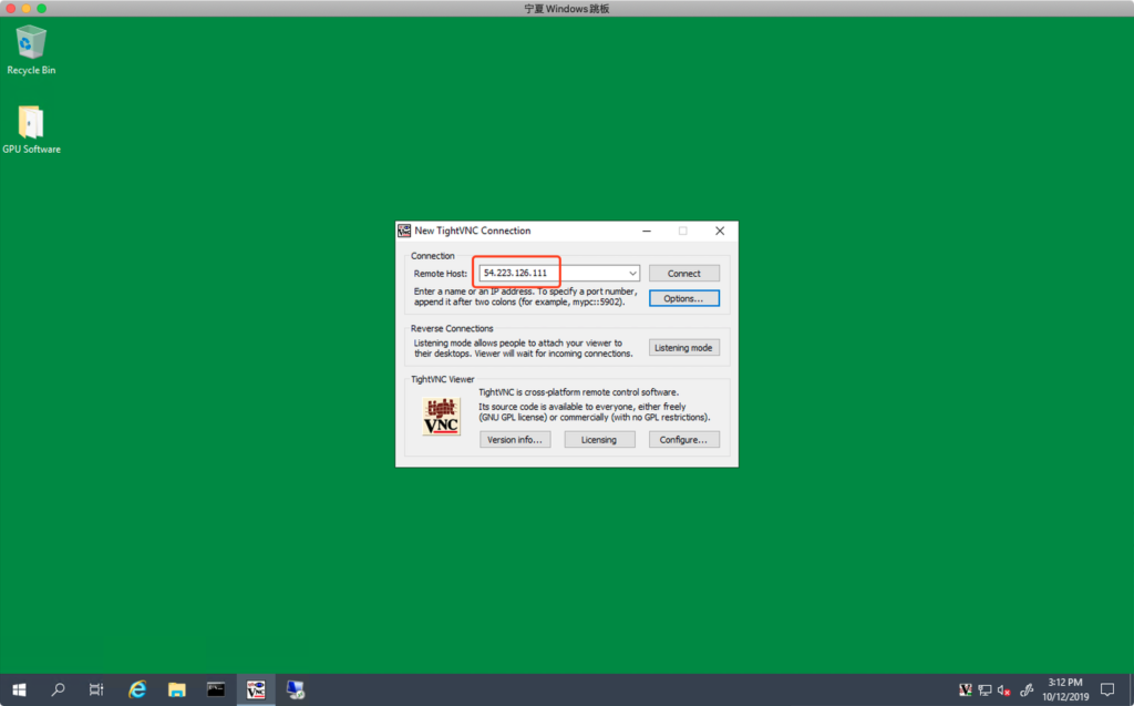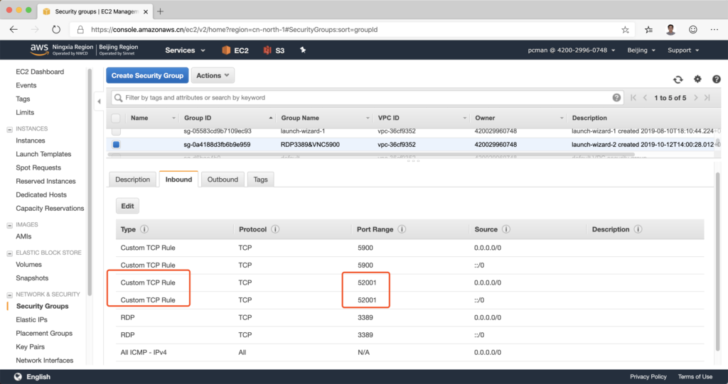 前文解释了以上演示是通过AWS宁夏区域的另外一个Windows跳板去访问位于北京的带有GPU的G3实例。这样的原因是某些运营商限制了VNC常用的5900、5800,并且常见的桌面 :1 和 :2 对应的5901和5902这些都一并封杀了。经过测试,在北京联通的接入地区使用52001端口可以访问。