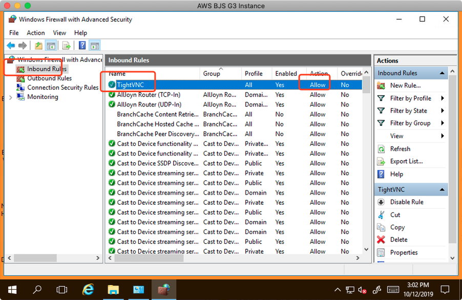 进入高级防火墙配置界面后,左上角选择入栈规则,最上方第一条就是TightVNC安装程序,将自己加入了放行名单。因此本步骤主要是确认防火墙开放正常。