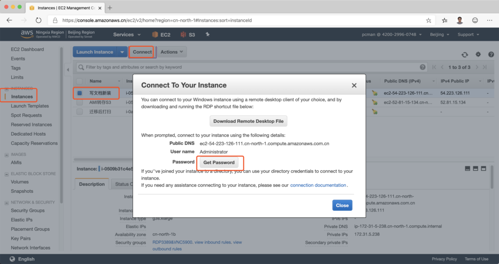 在AWS上创建好的Windows实例,管理员密码非常的变态而安全。对于不熟悉EC2 Windows的人来说我们增加一点解释。从EC2进去,找到Windows实例,点击上方的按钮连接,这时候提示,需要按Get Password才可以获取密码。如下截图。