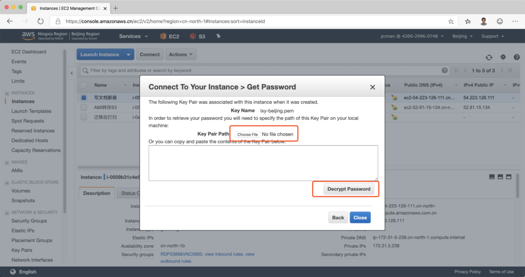接下来可以看到,AWS提供的EC2 Windows的AMI镜像,是没有默认管理员密码直接暴露可见的,创建Windows的第一时间也不能配置。这与国内一些云直接在模版中明文提供密码的安全方式有非常大的区别。为了获取密码,您需要上传证书文件,也就是登录Linux实例时候用的pem文件。然后点击解码,才能显示出来密码。如下图所示。
