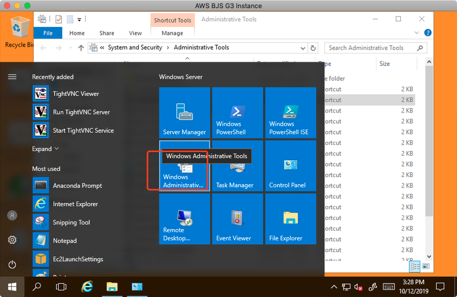 点击开始菜单,在Windows Server 2016的这里选择系统管理。