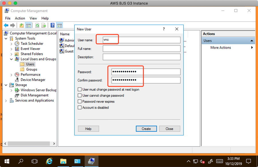 在弹出的新建用户界面,输入登录名“VNC”,密码注意一定要设置的足够复杂,当然不需要32位那么夸张。还有更多密码选项,例如首次登录是否强制修改密码,是否允许用户修改密码、和密码是否过期,这里为保证安全,不要选择密码用不过期。然后点击Create按钮,完成创建。