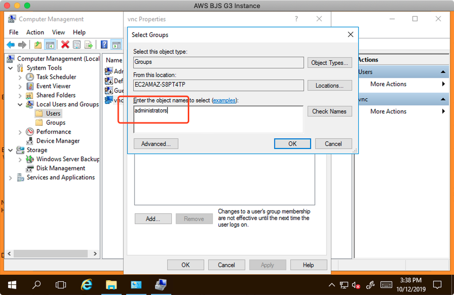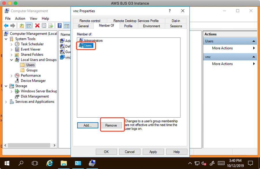 添加完成后,可以看到用户VNC同时属于Administrators和Users两个组。为了严格管理,建议删除掉Users组,让用户只输入管理员组。如下截图。