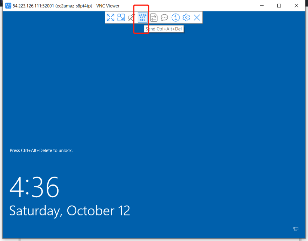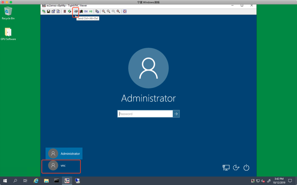 接下来要继续完成Windows登录认证。Windows登录时候需要按Ctrl+Alt+Del键,这是从Windows NT3.5时代延续了20年的微软的习惯。不同厂家的VNC客户端一般都会提供发送组合键的快捷键,因为一般透过远程桌面等工具,快捷键都是不生效的。如下截图,红框里边就是发送登录Ctrl+Alt+Del键。