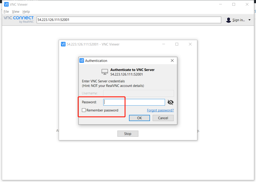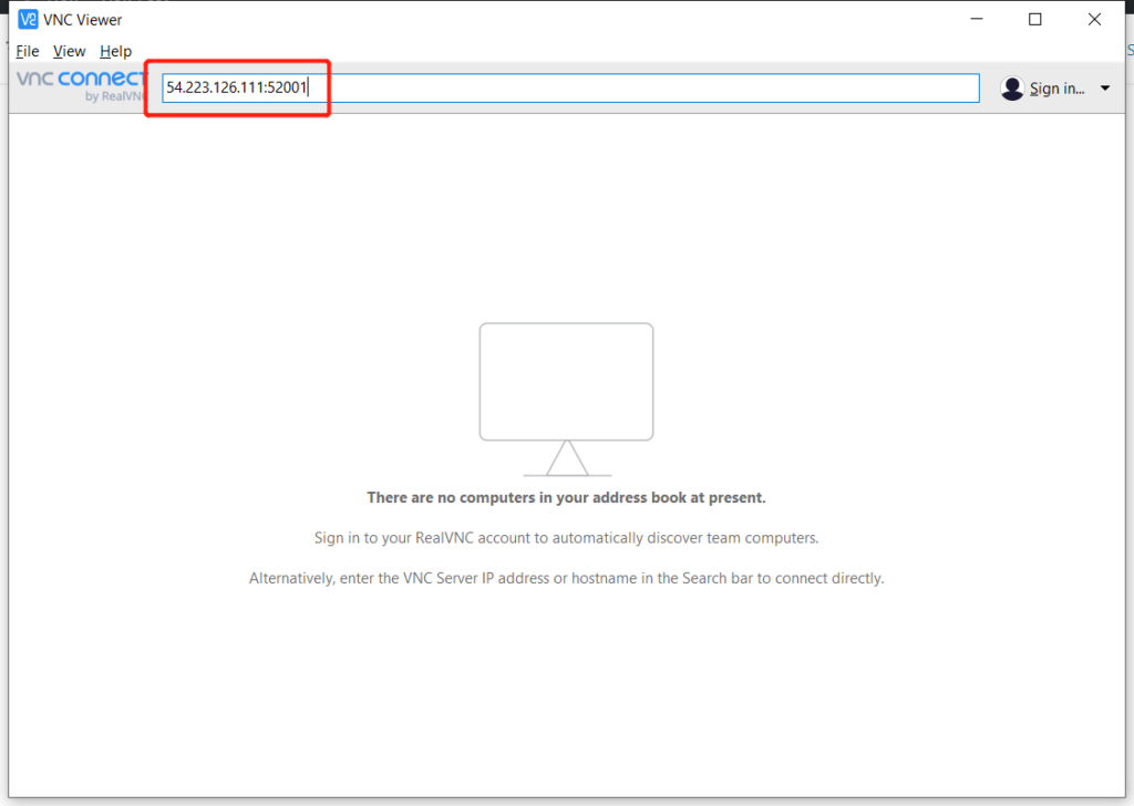 启动RealVNC Viewer客户端后,在地址栏输入Server的EIP和端口号。然后按回车键。
