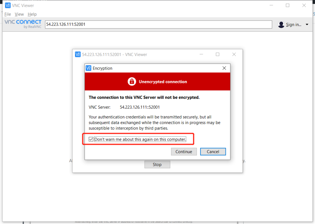 接下来弹出的对话框,提示这个访问是没有加密的VNC访问。这里可以忽略并点击以后不再提醒。