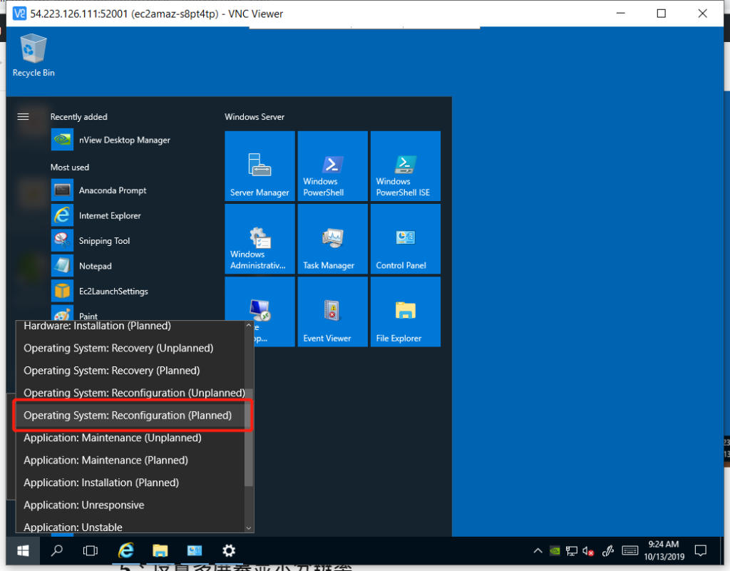 接下来重启桌面。重启的时候Windows Server会询问重启原因,这里随便选择一个就可以了。也可以如实选择。