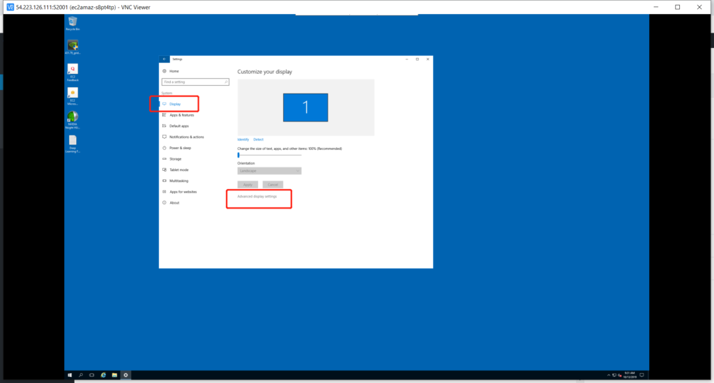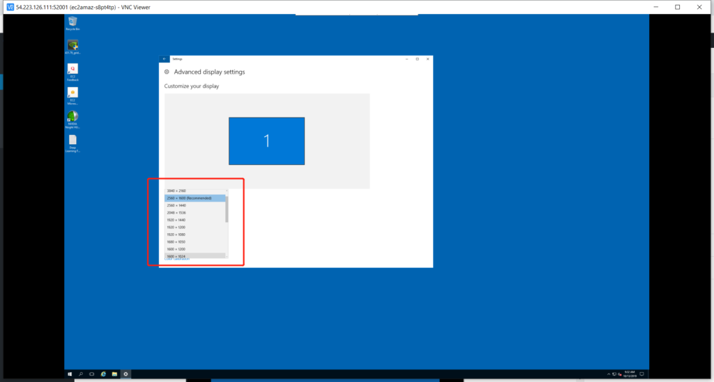 如果要降低分辨率,此时操作就和一台普通笔记本一样,因为VNC操作的其实就是本机的控制台,所以不像用RDP协议时候是不能调整分辨率和字体大小的。如下截图,点击红色的位置进入限制配置界面。